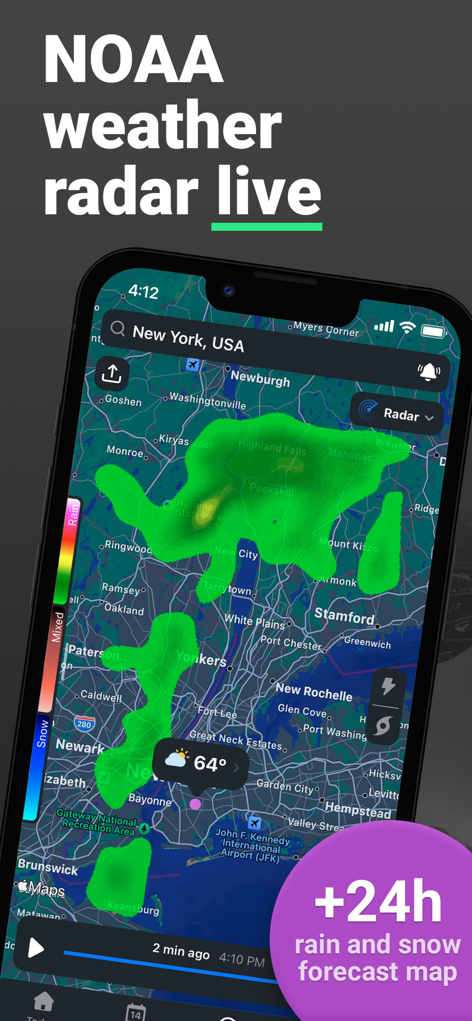 - Radar overlay shows the areas of rain, snow & mixed precipitation in high resolution and vivid colors right on the interactive map;