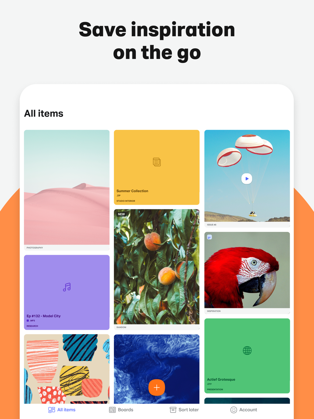 Collect is the best way to save everything that inspires you and fuels your ideas. Upload images and videos, save links and anything from across your apps, then organize it all into visual boards. You can share boards (if you want), and work together right in a board!