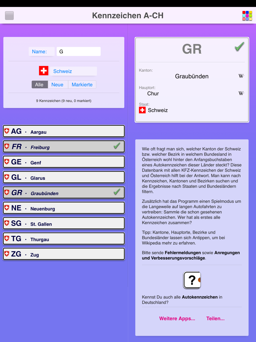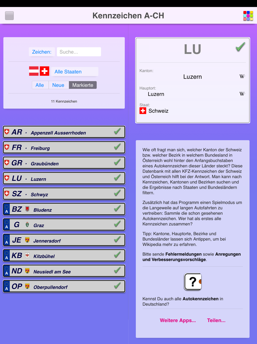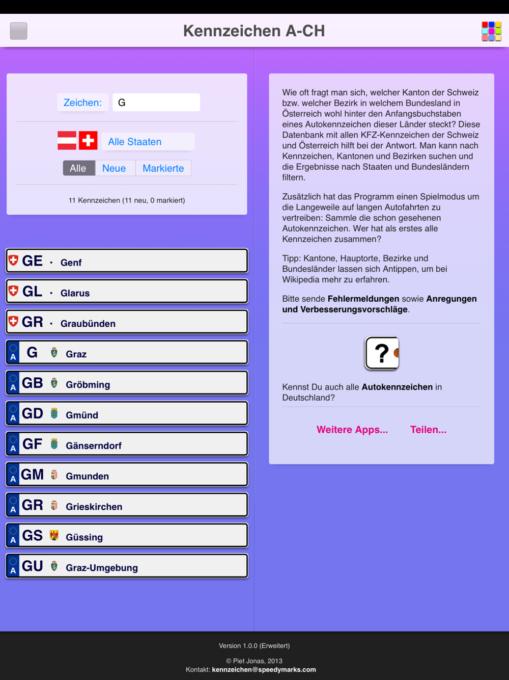 This application is in German, but can be used by anybody who travels through Austria and Switzerland or is curious about their license plates.