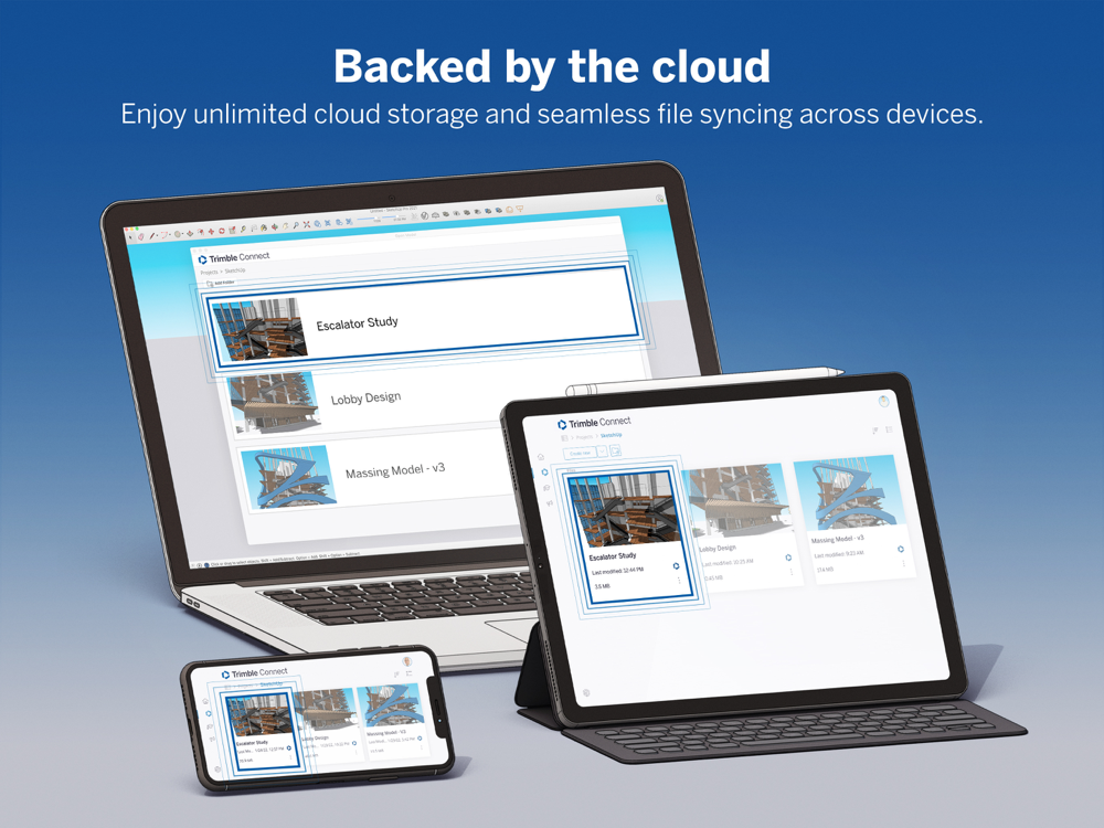 -With unlimited cloud storage, you can seamlessly sync files across your devices – and work on them using SketchUp for iPad, SketchUp for Web, and SketchUp Pro desktop apps.