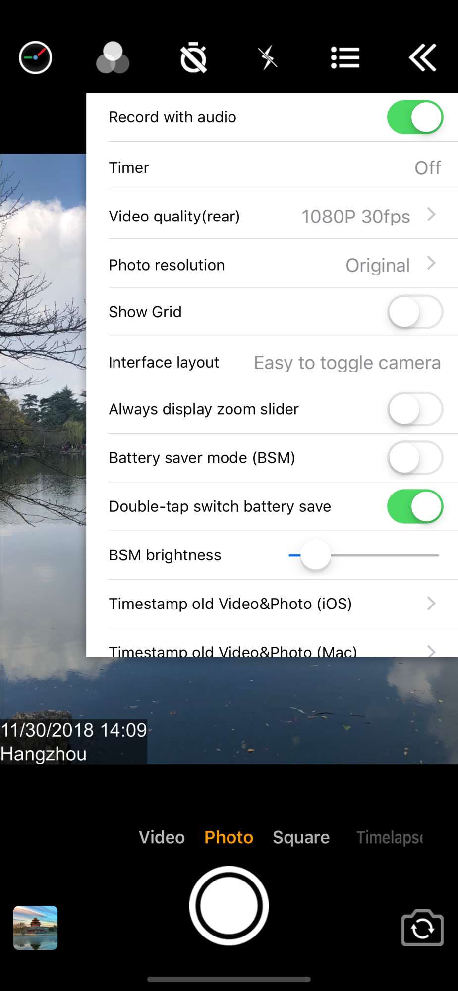 • Has 4 modes. "Video", "Square", "Timelapse" support record video and capture photo. "Photo" mode only support capture photo with special optimization.