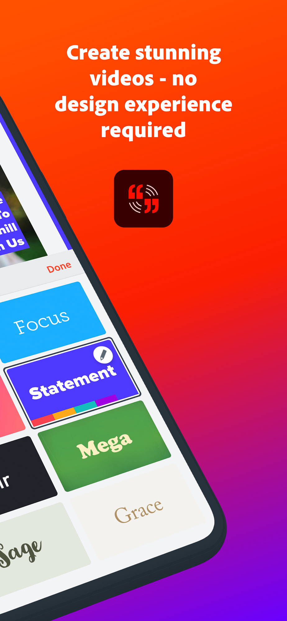 Adobe Spark Video helps anyone create compelling video stories in minutes. Easily add and trim video clips to make your videos stand out on social. Pick from over 1 million beautiful iconic images or add your own photos to highlight what you have to say. Select the soundtrack that works best. Then Spark Video automatically adds striking cinematic motion to your story — no design experience needed. Share your video to make an impact: persuade, inform and inspire your audience. And did we tell you it's all free to get started?