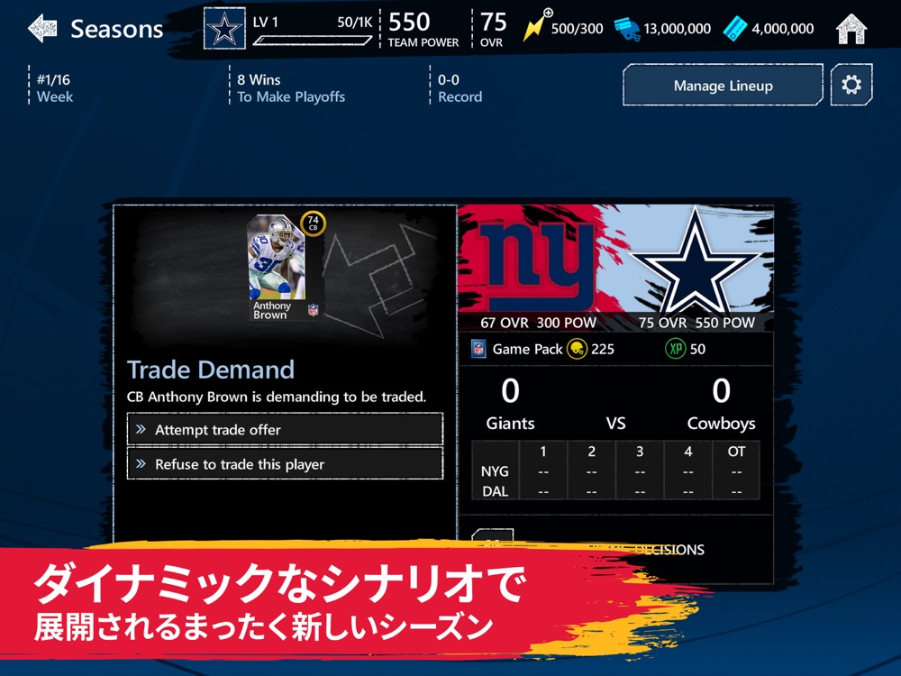 自分のNFLフランチャイズを選択してGMになりましょう。選手と契約したり交渉したりしつつ、デイリー目標をクリアして新しい選手をアンロックしましょう。また、チームをスーパーボウルに導いてNFLでの支配を築き上げながら、NFLシーズンを通じたダイナミックなシナリオを体験しましょう。