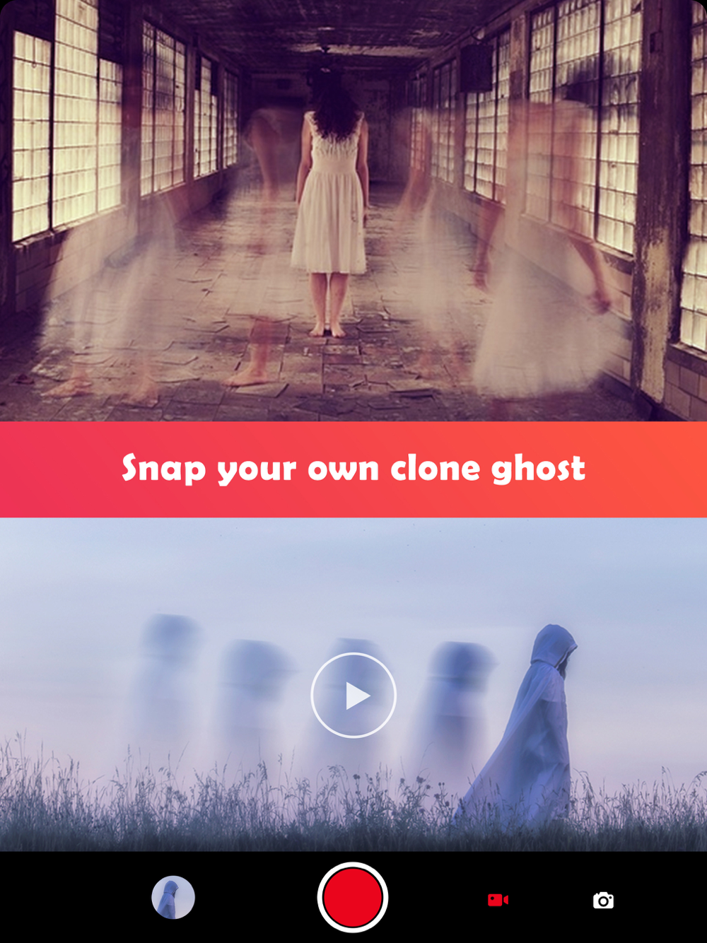 Ever wonder what look like when your spirit free itself from the body? Use Ghost Lens to have an out-of-body experience and snap STUNNING video&photo to impress your instagram and snapchat follower. This app can change transparency of the video character and add “Fade in” and “Fade out” effect to your video&photo, so that you can make your “GHOST” looming in your video. It supports up to 60 minutes video recording. Not enough? You can also use this app to do much more things. For example: