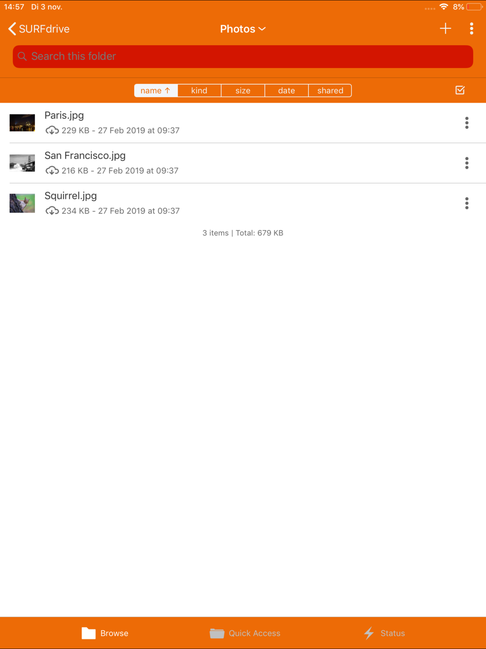 Welcome to the SURFdrive app for iOS. This App can be used to access your files in the SURFdrive environment, available at https://surfdrive.surf.nl. With this App you can: