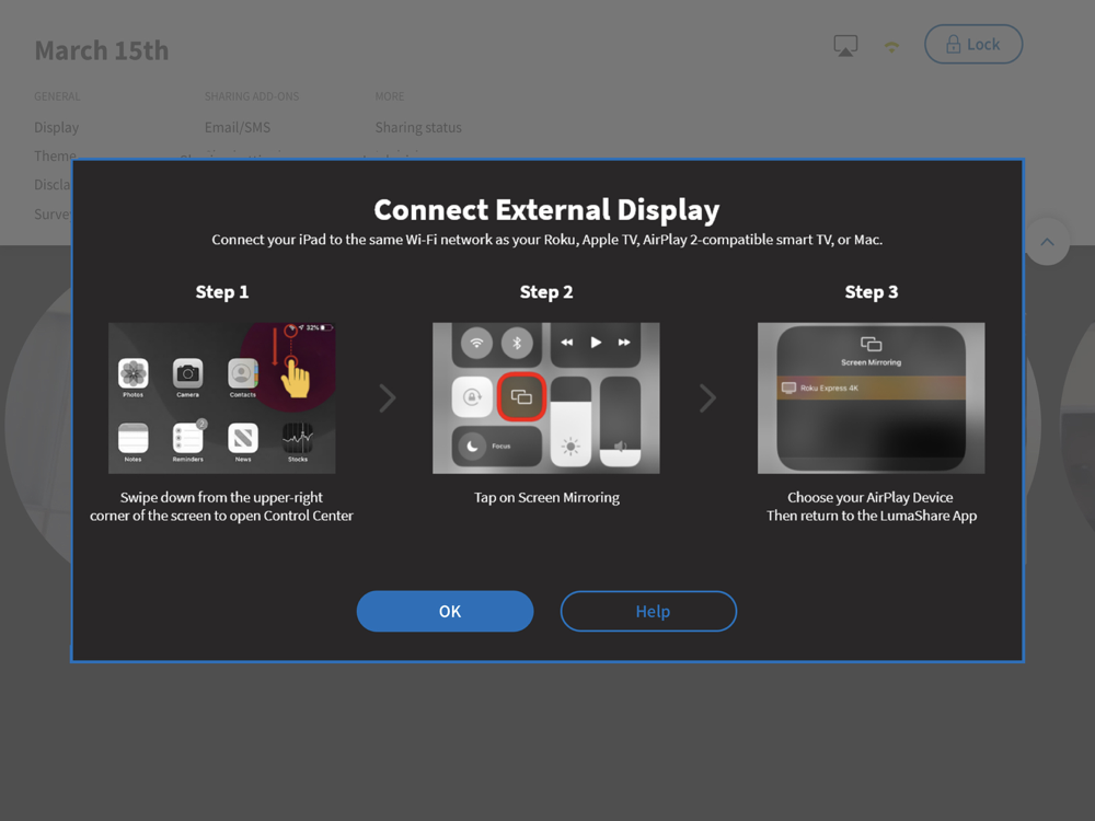 LumaShare has a built-in slideshow feature and can play the slideshow in the background to any AirPlay 2 device such as Roku, AppleTV, or AirPlay-compatible Smart TVs or over an HDMI cable.