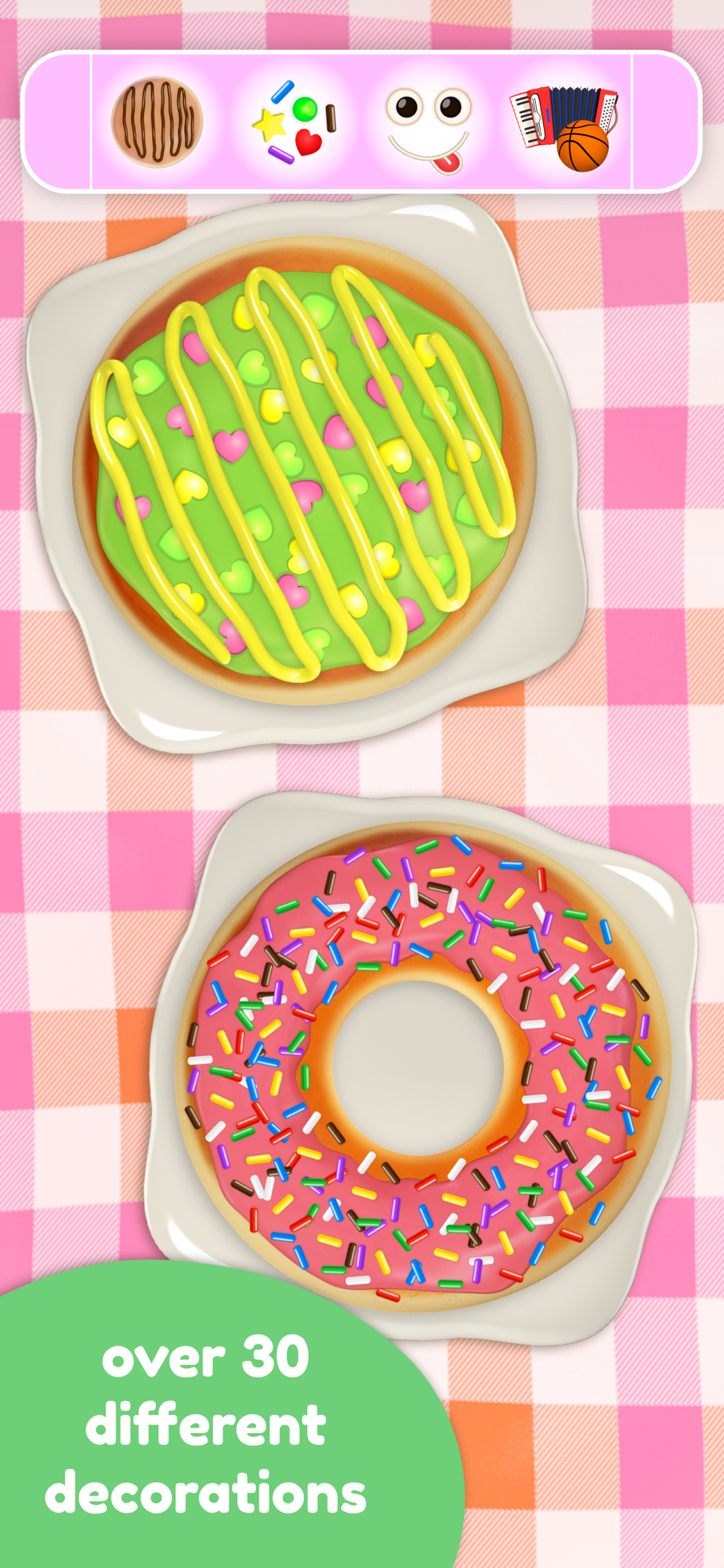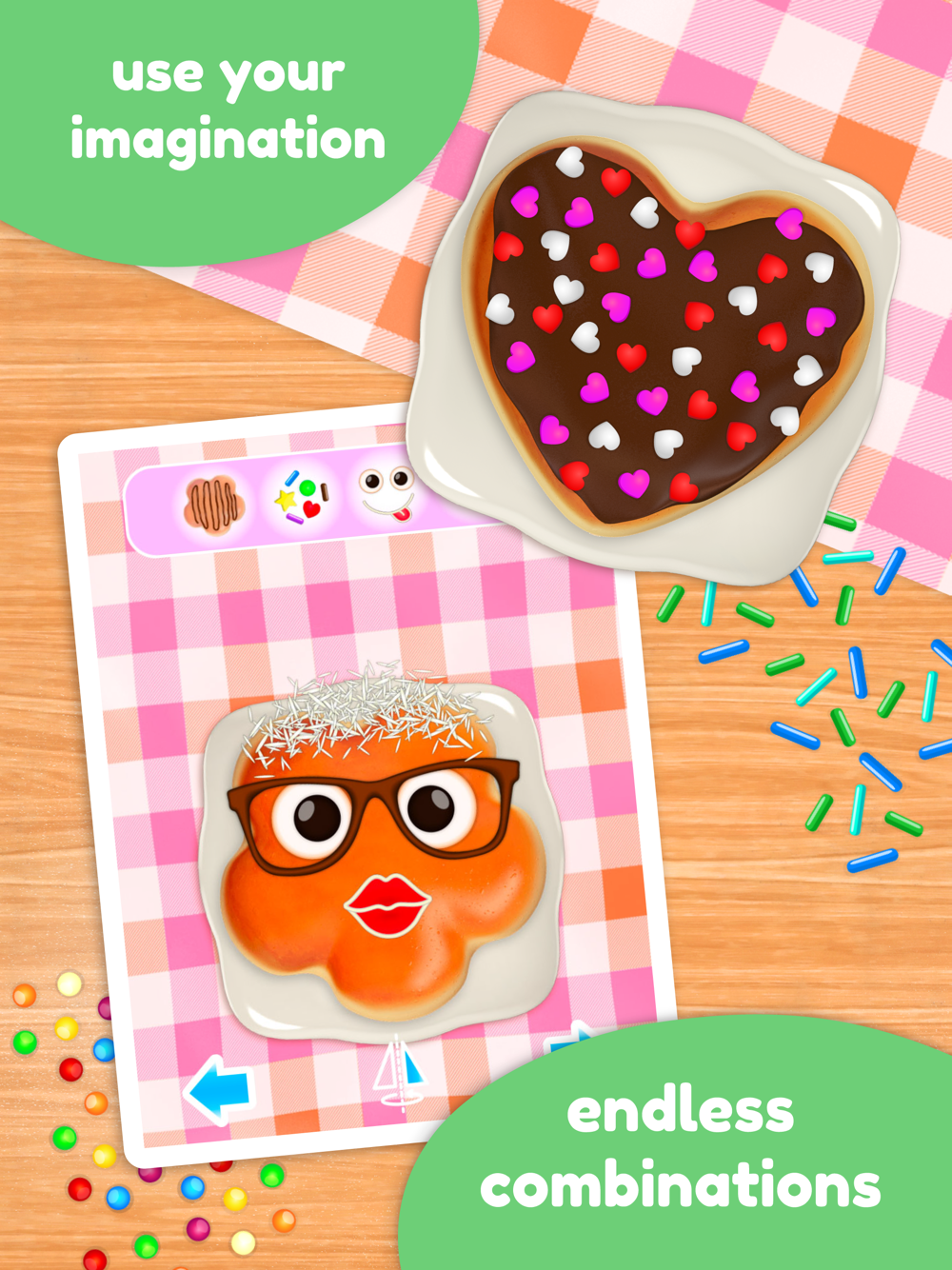 Once the donut is perfectly fried you can decorate it. There are many colorful glazings, toppings, sweets, toys, sprinkles and other decorations to choose from, so your donut will never look the same. For some extra laughs, you can also make them look like funny faces. Making donuts has never been so fun and your creativity is the only limit!