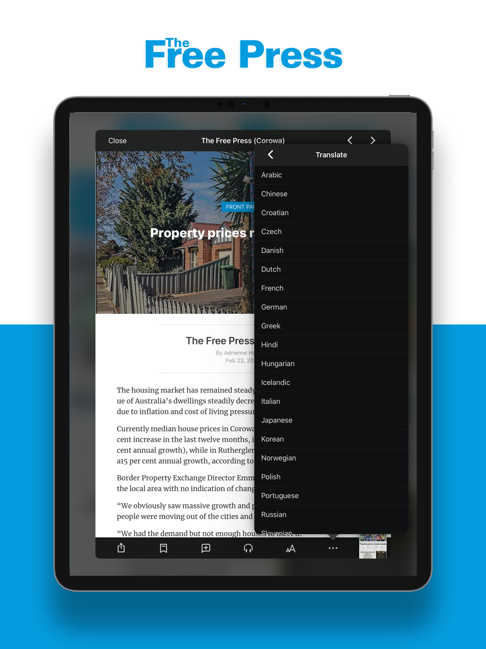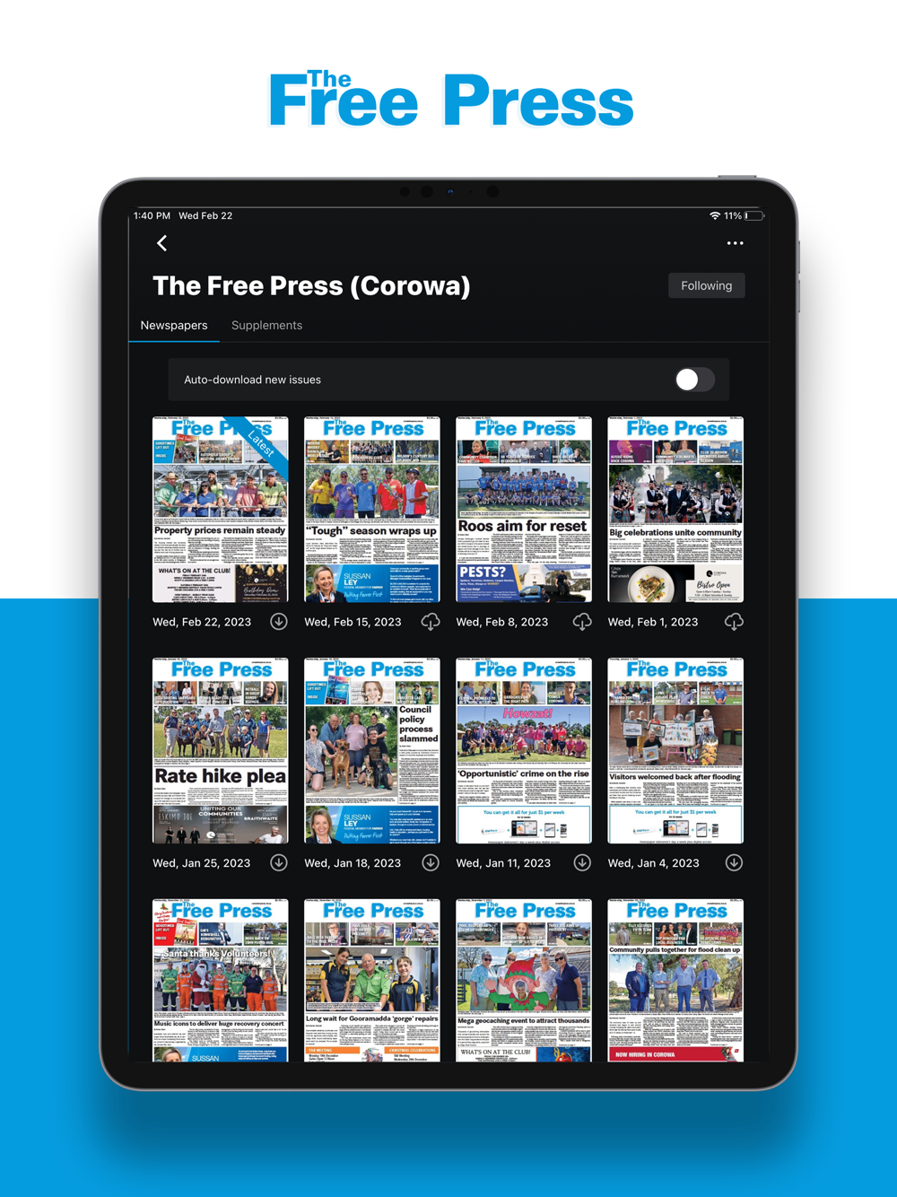 Looking to have Corowa Free Press at your fingertips? Then look no further than Corowa Free Press app from PressReader. With this app all sections are presented as full-content digital replicas, in their original layout. You can subscribe to the epaper through this app and download the publication wherever you are. Flip pages, pan and zoom in to view any page, article or photo in stunning clarity.
