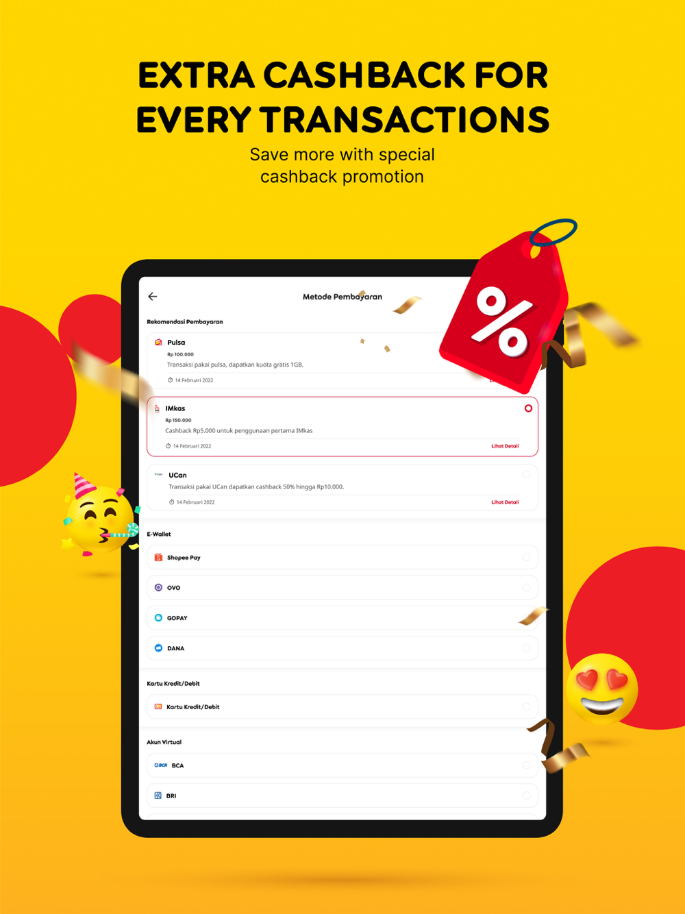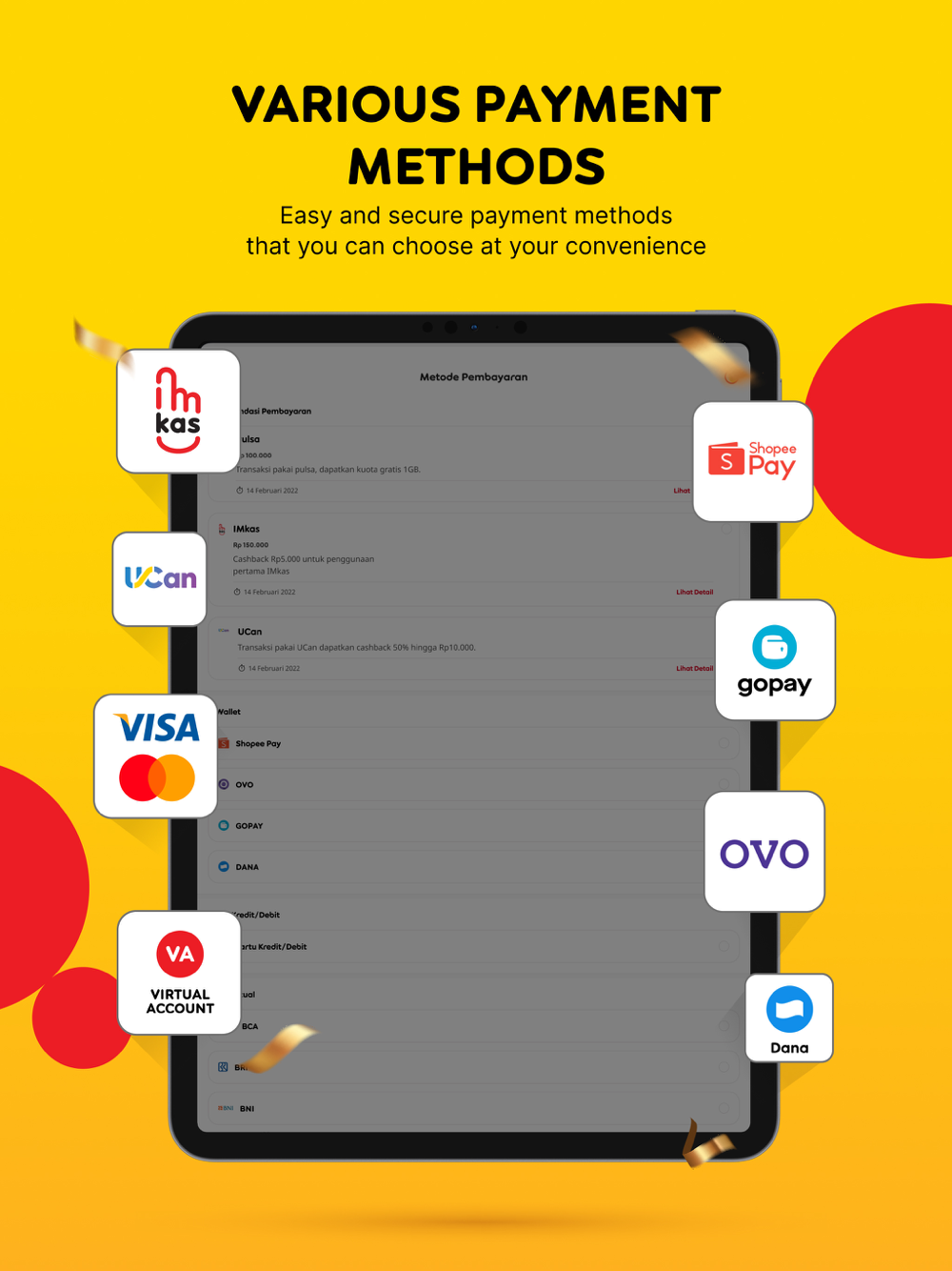 There is an easy and safe payment option to buy credit, internet packages, or pay your postpaid bill via the MyIM3 application. Can use OVO, Gopay, Bank Transfer, Debit/ Credit Card, Physical Vouchers, and Shopeepay.