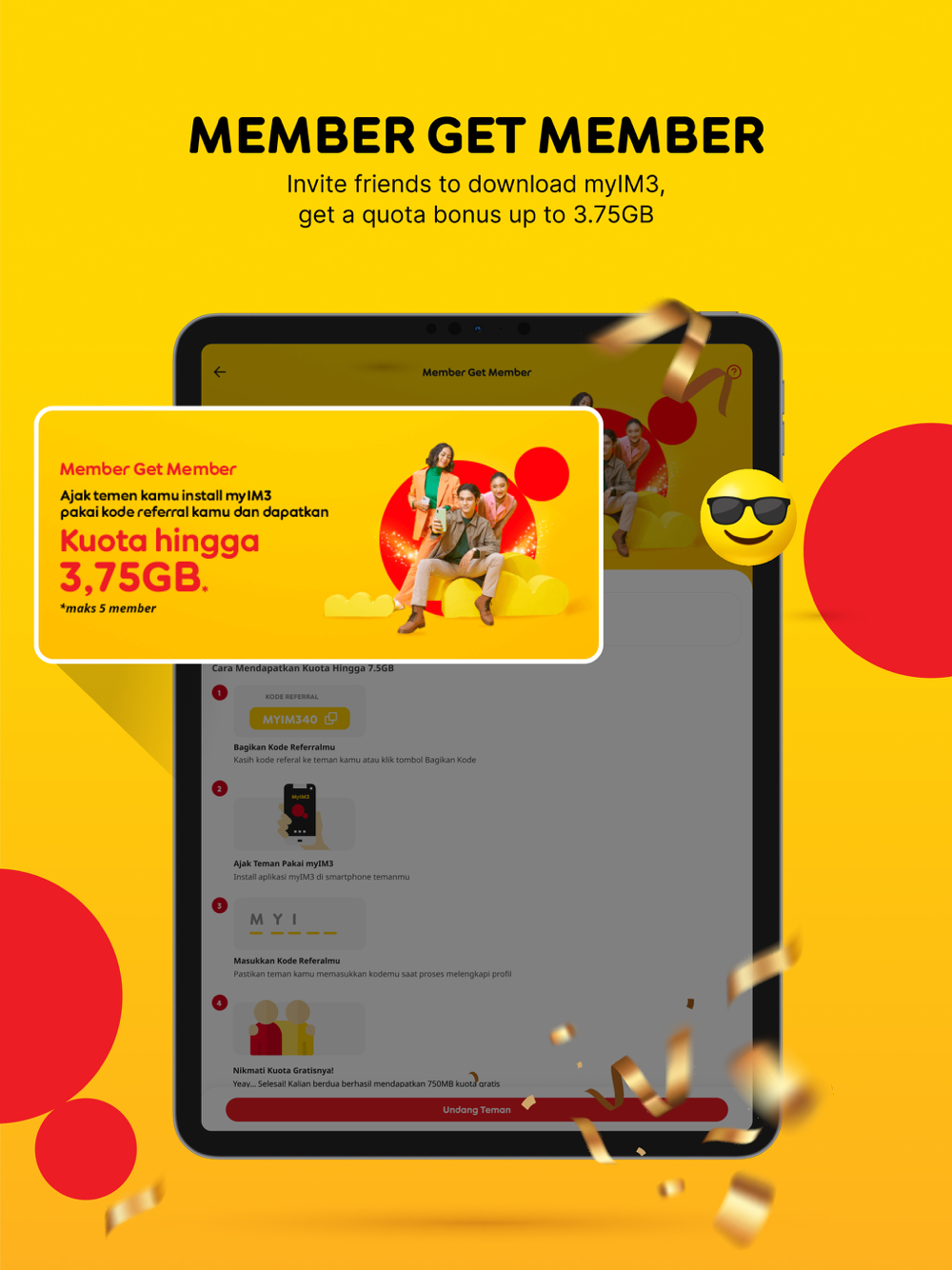 In addition to get the extra quota up to 100GB from Tendangan Bonus, you can also get an extra quota of up to 3.75 GB by inviting your friends to install this application. It's easy, right? #LebihUntung with myIM3!
