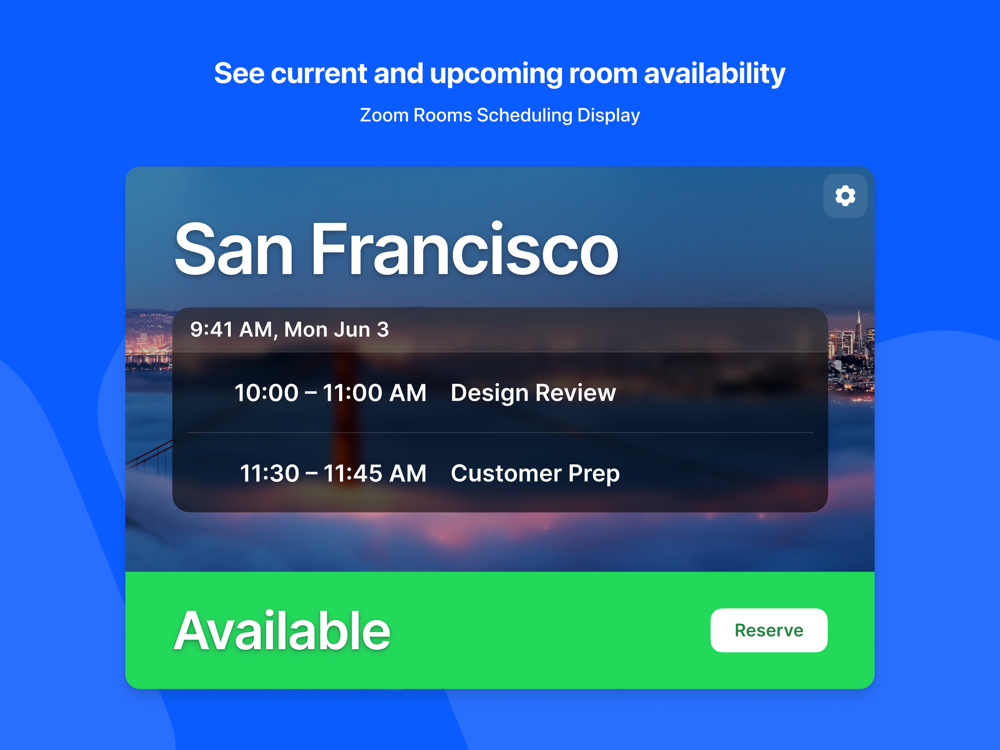 The iPad can also be switched to the Scheduling Display mode and placed outside the Room to show current availability, display upcoming meetings, and allow you to reserve time for an instant Zoom meeting.