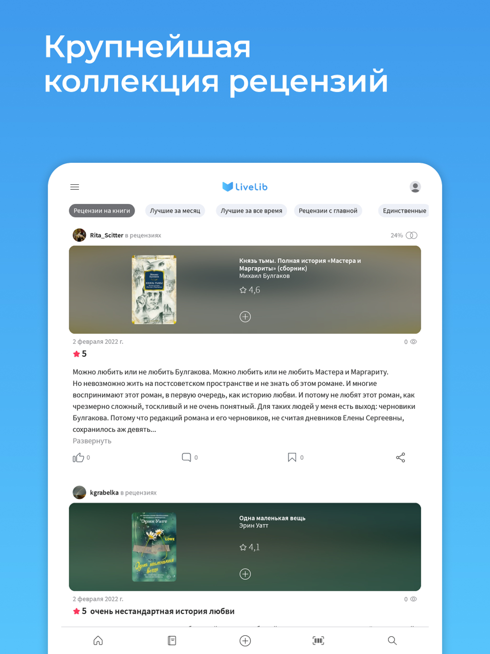 Отзывы о книгах, рейтинги, сканер штрихкодов, доступ к своему аккаунту livelib.ru и многое другое!