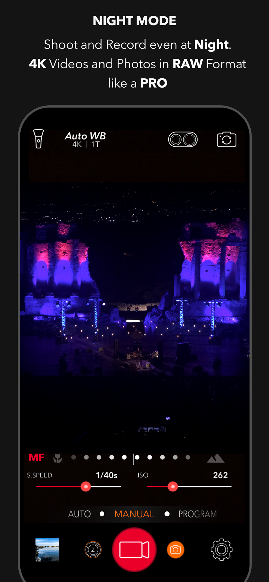 Manual Mode - modifies: Shutter Times, ISO Sensitivity, Manual Focus, Manual WB