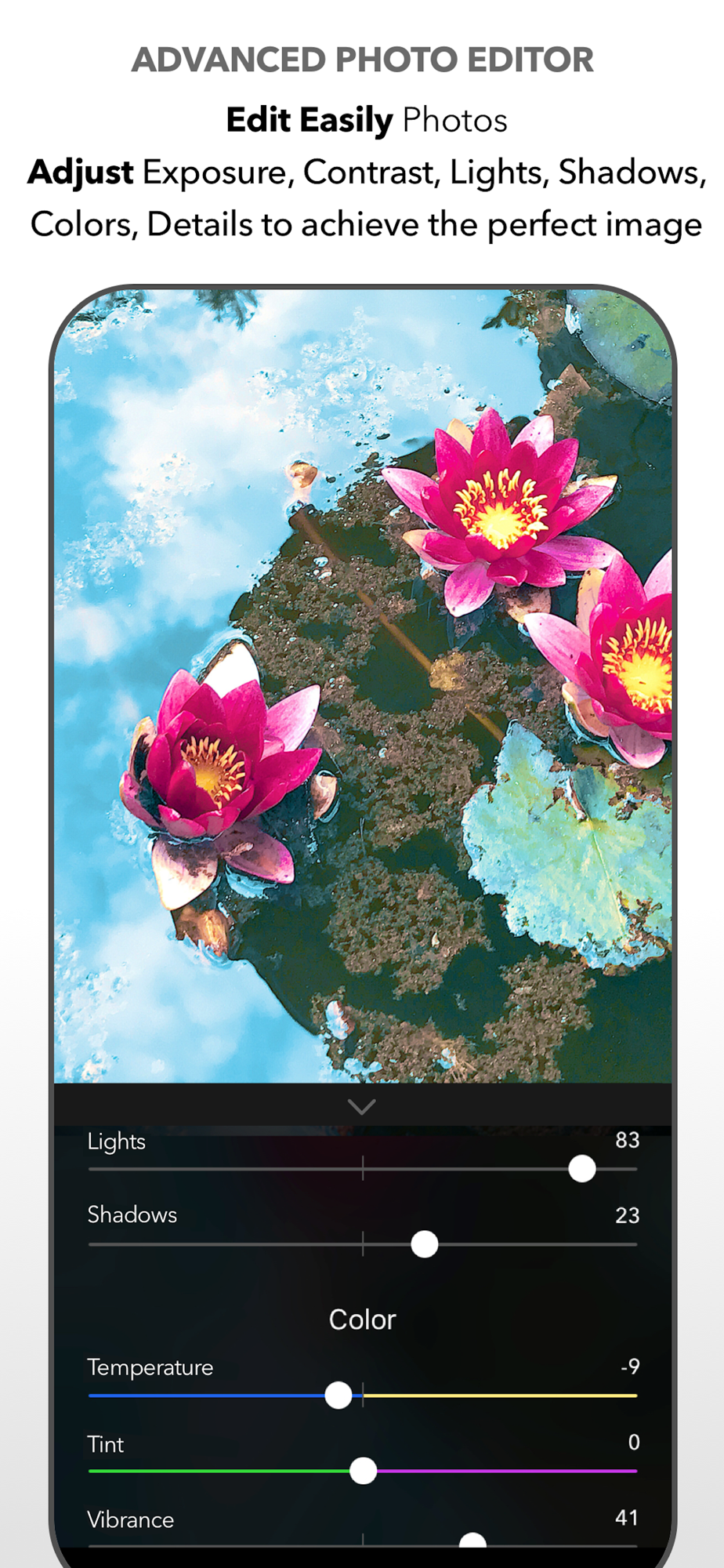 Photo Editor is fast and complete, allowing you to make your shot even better. You can adjust: Exposure, Contrast, Lights, Shadows, Color Temperature, Saturation, Vividness, Structure, Sharpness, Photo Noise, and Vignette.