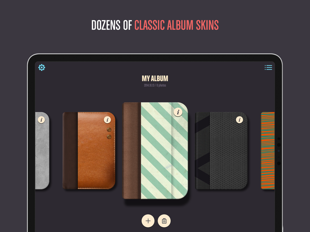 The album skins are modern, bold, and animated, with timeless illustrations.