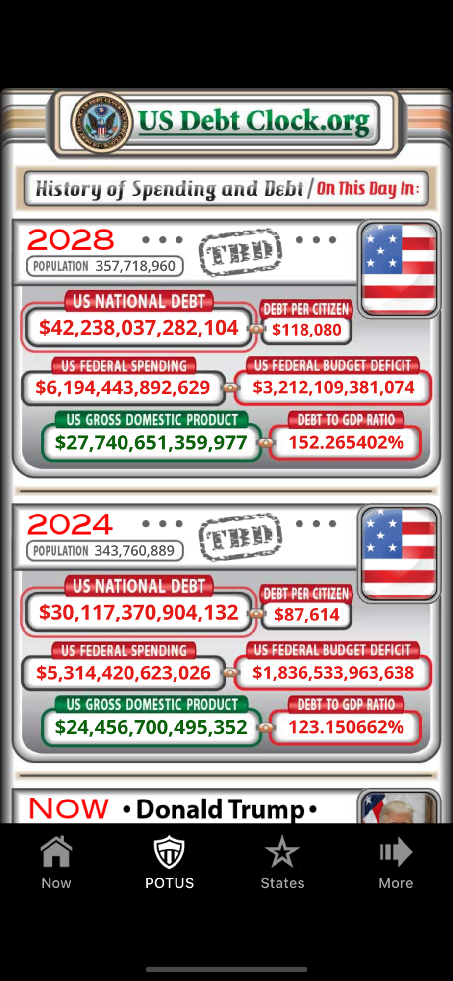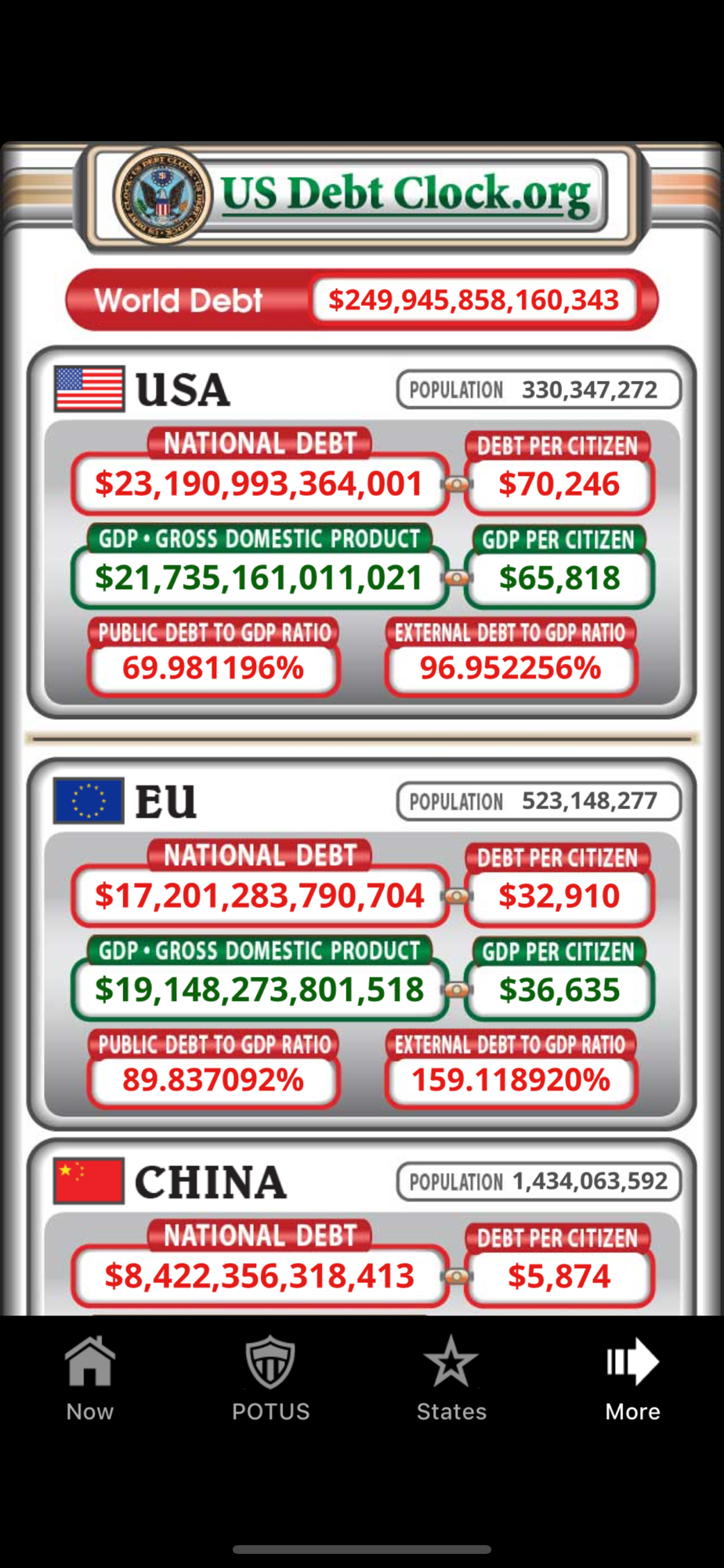 The US Debt Clock .org App gives you a Real-Time glimpse of the most relevant economic data showing the financial condition of the US Federal Government, the 50 States and the World with over 3000, up to the Second Data Fields.