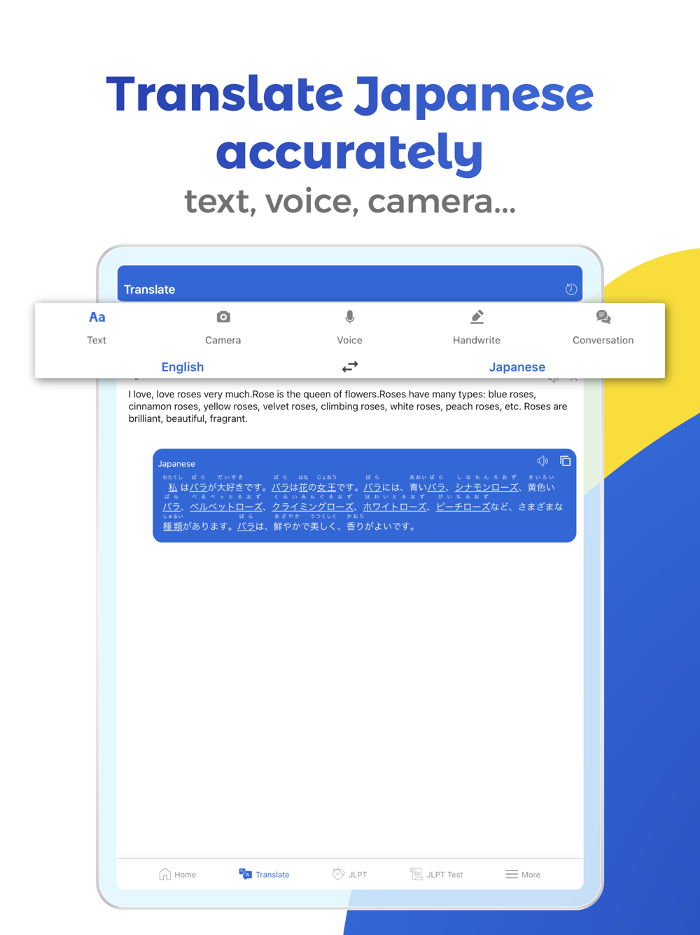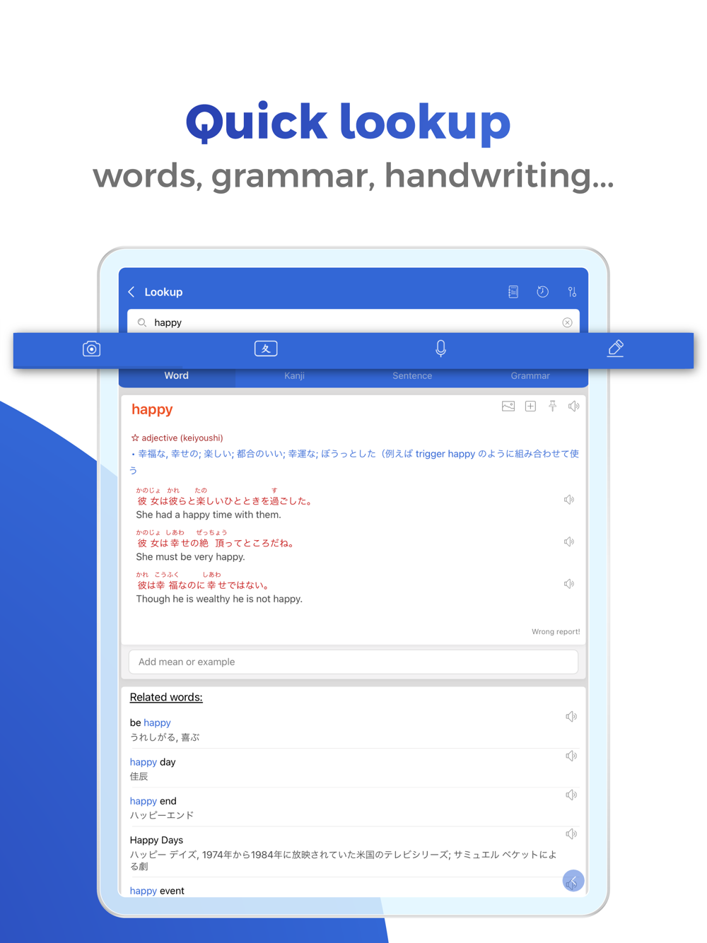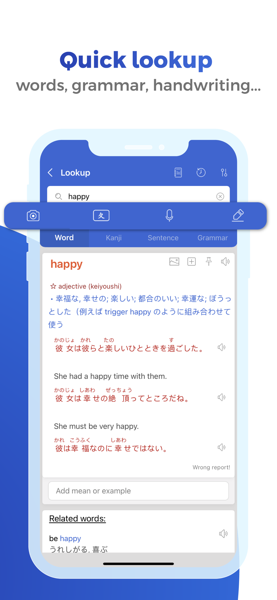 Reputable Japanese dictionary and learning application with full features: lookup, detailed translation, pronunciation practice, Japanese writing practice, many vocabulary topics and grammar correction, JLPT exam preparation