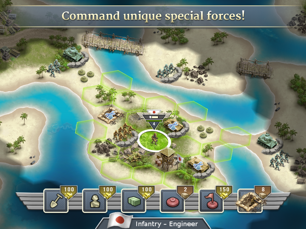 Choose the right tactics and use your commando to defeat the enemy! Lead the U.S. Army on their campaign or command the Japanese forces on their mission! Take out enemy alliances with infantry, artillery, tanks, warplanes, battleships and submarines and earn your stripes as an ingenious commander at the PACIFIC FRONT!