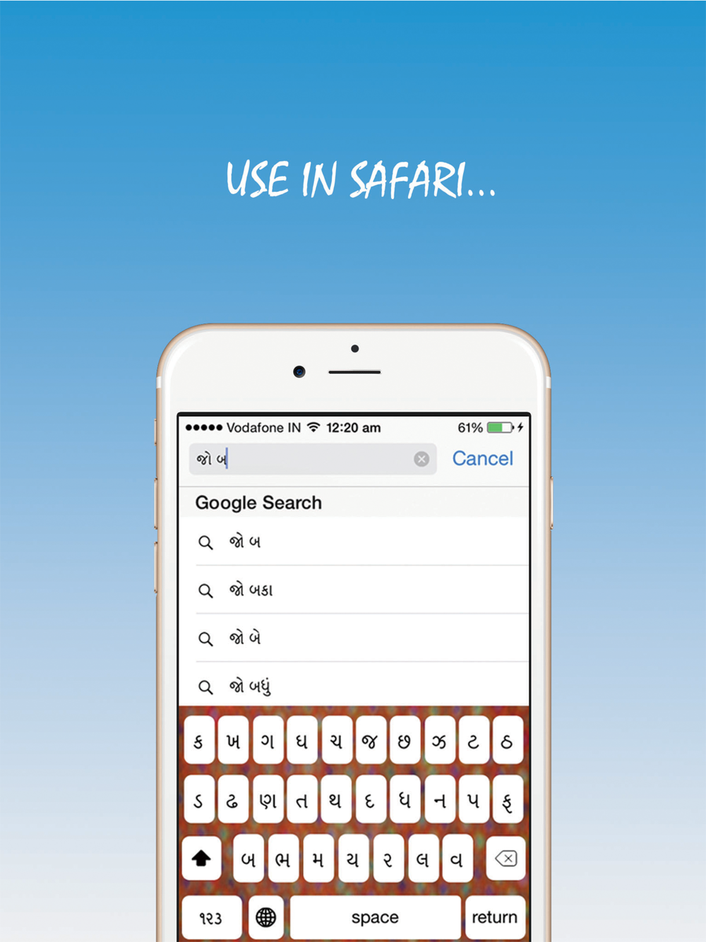 Designed for ios 8, Now you can type in Gujarati in anywhere, including Messages, Whatsapp, Kik, Line, Wechat, Email, Facebook, Twitter, Notes, Skype, LinkedIn, Messenger ,instagram etc..