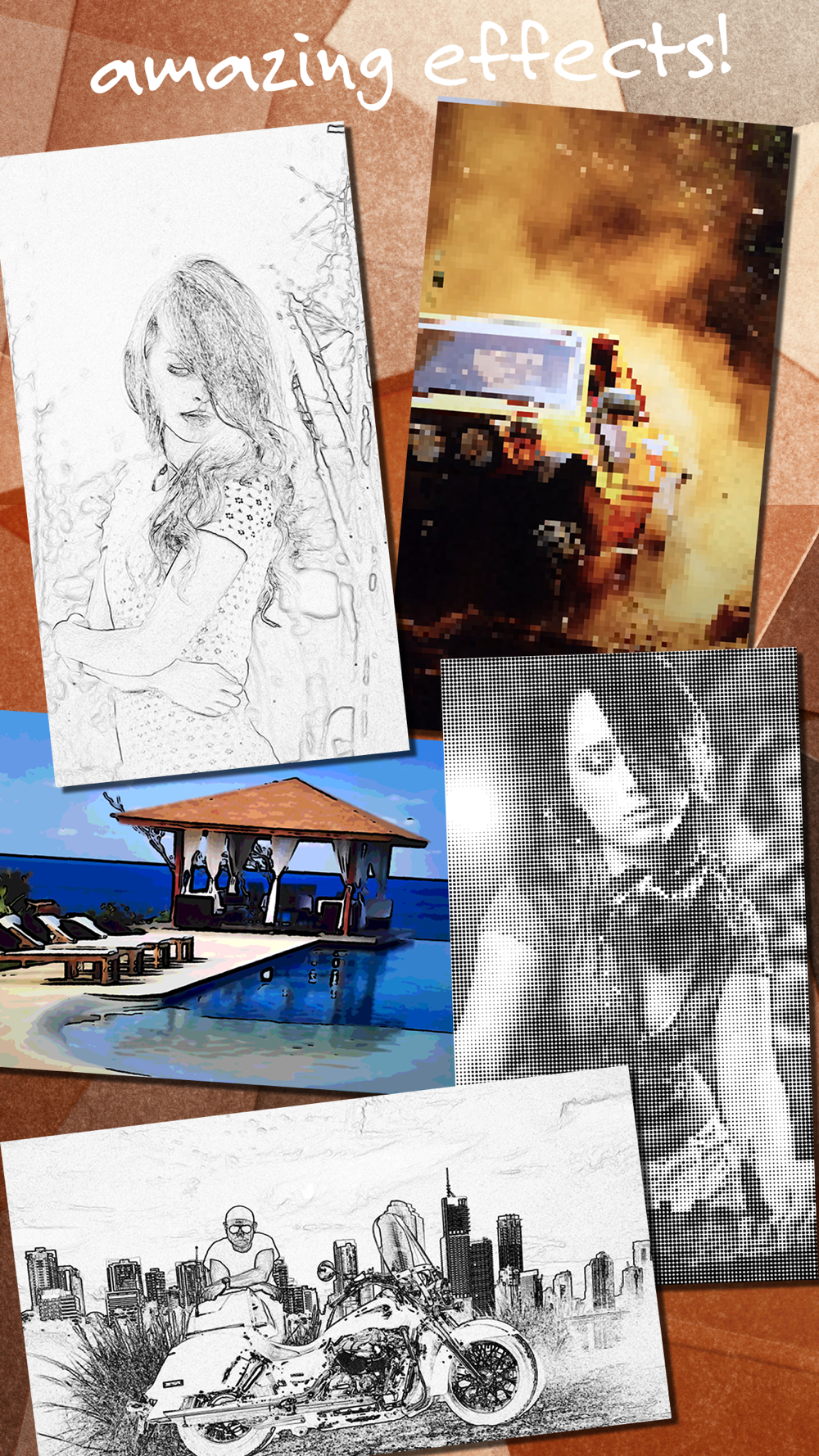 -> 8 amazing effects/filters: Sketch, Cartoon, Dots, Halftone, Crosshatch, Swirl, Pixellate and Emboss