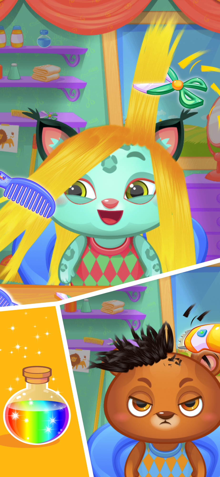 Lovely pets are sitting in front of a mirror and waiting for new, funky haircuts. Bears, cats, dogs and rabbits want to be real movie stars at least for one day. Design creative hairstyles for your customers before the curtains close.