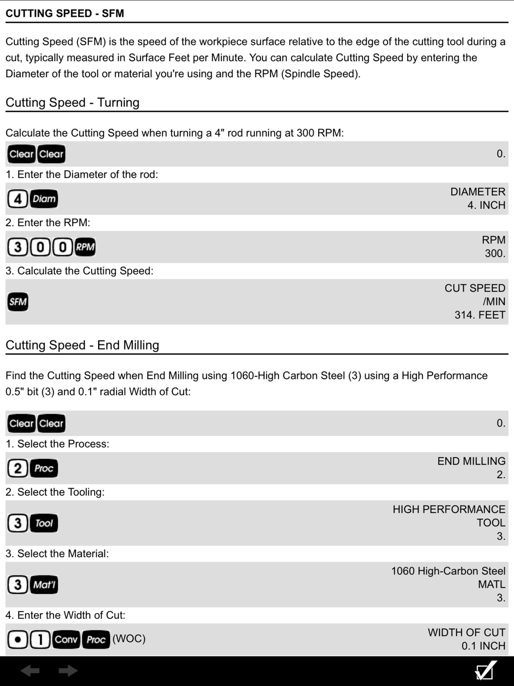 • NEW - Machining-specific keys to enter or calculate Surface Feet per Minute (SFM), Inches per Tooth (IPT), Inches per Minute (IPM), Inches per Revolution (IPR), # of Teeth, Depth of Cut (DOC), Width of Cut (WOC) and Length of Cut (LOC)