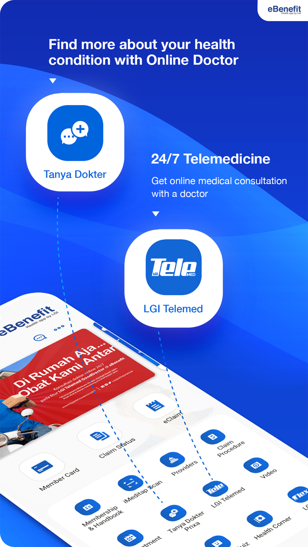 LippoInsurance selalu menjamin kemudahan layanan asuransi Anda dengan eBenefit. Semua bisa melalui Handphone. Dengan aplikasi eBenefit, nasabah Medicare dapat mengakses fitur/informasi berikut:
