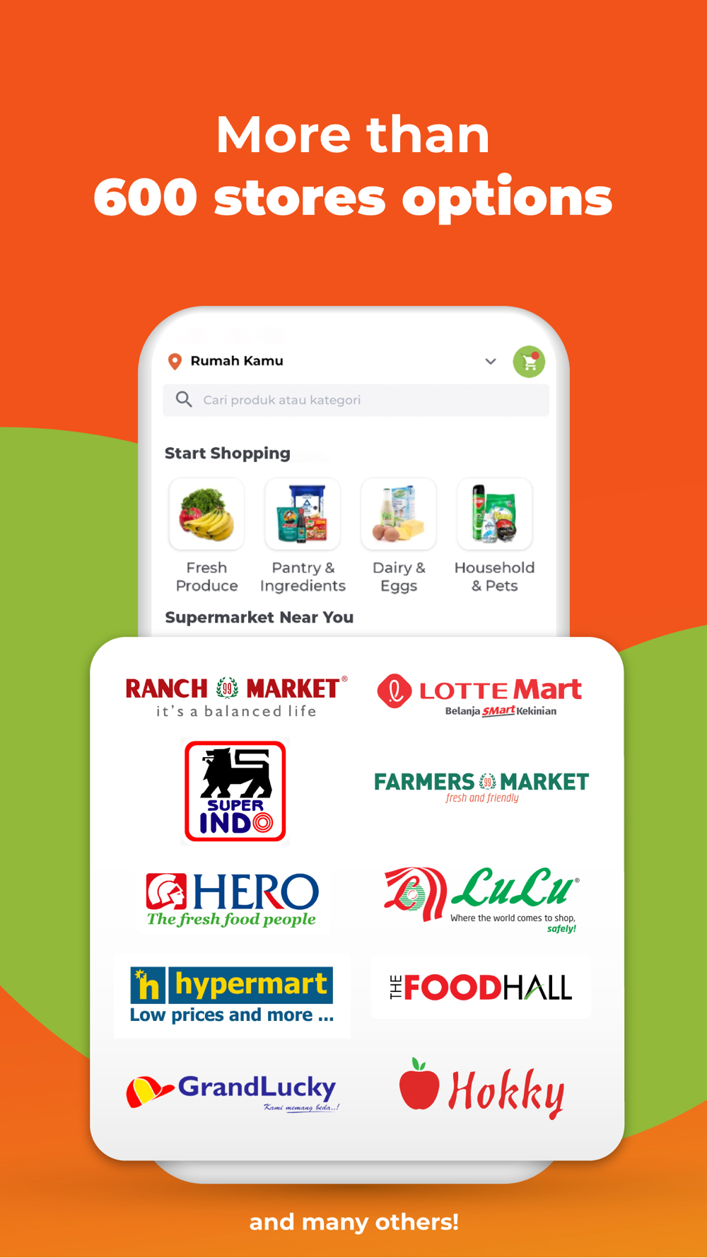 • Hypermart Online, Lotte Mart, Ranch Market, Farmers Market, Pepito, Lulu Hypermarket, Hokky, Prima Fresh Mart, Tip Top, Grand Lucky, My Super Indo, Hyfresh, Frestive, Pasarnow, Hero, Papaya Fresh Gallery, The Foodhall, & more.