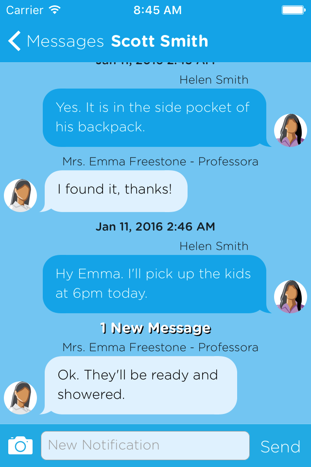 * Messages: send a message straight to your kids’ teacher or to daycare principal and be notified when you receive a response.