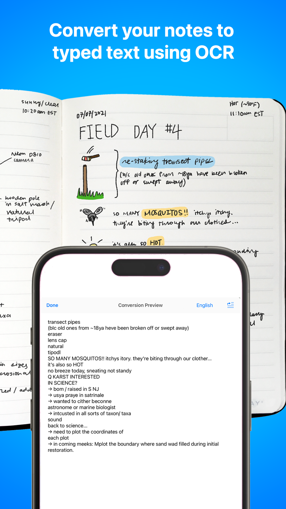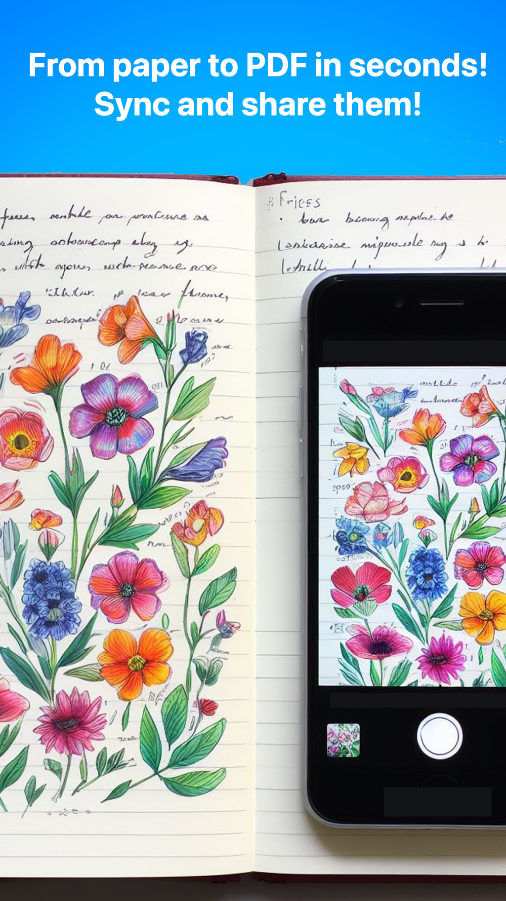Scan quick and easily real-world objects such as documents, notes, receipts, books, magazines, id cards, business cards, whiteboards and even your photos, etc., and add them to your digital PDF notebooks.