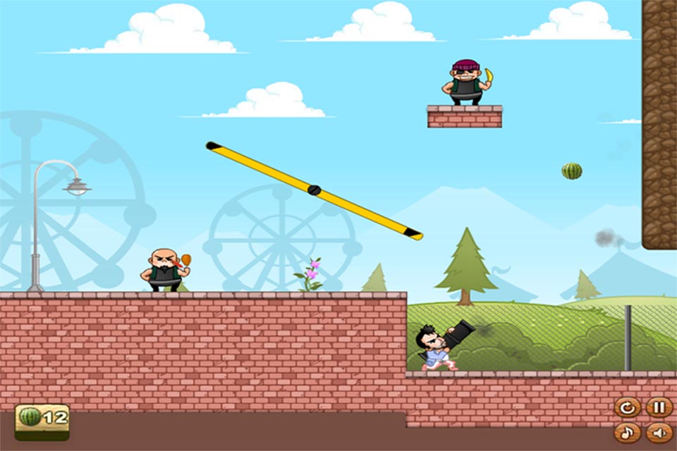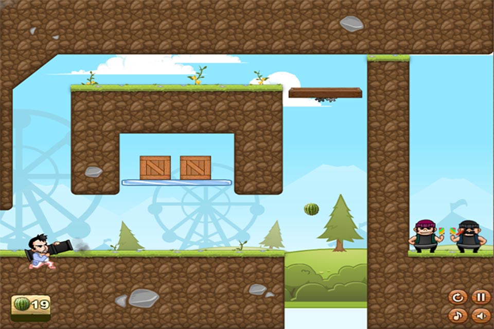 Some thieves go after electronics or jewelry. But this band of robbers has instead absconded with one poor fellow's groceries! Help reclaim his food with an ammo belt full of watermelons and a fruit-firing bazooka! Aim and fire at the crooks in this shooting-based puzzle game, and defeat them all to move on. Sometimes you'll have a straight shot, but more often than not, you'll have to bounce shots off walls, carefully manipulate boxes, and even utilize TNT to take them all down!