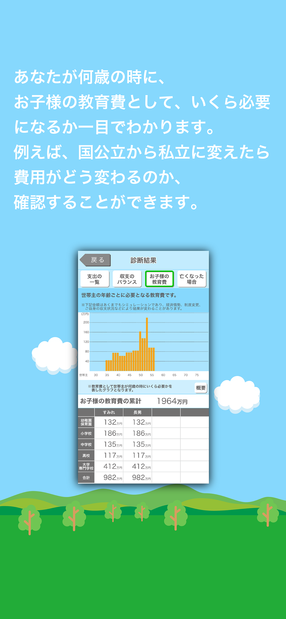 人生の3大資金といわれる「住宅資金」「教育資金」「老後資金」についても、現在の収入と支出を把握してシミュレーションすることができます。