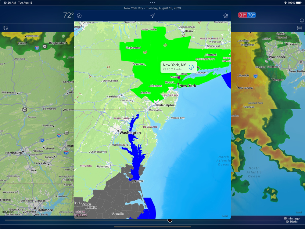- A long tap on radar map shows weather at that coordinate