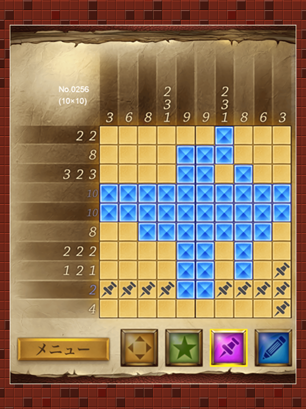 It’s easier to begin solving puzzles from rows where hints have biggest numbers. Cells with uncertain status can be marked with pin. If you have a good guess, but still not sure, try memo pen!