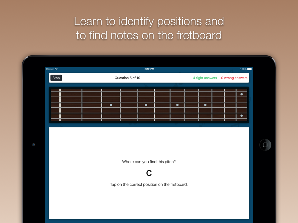 With Fretboard Trainer you can do exercises that help you memorise all the notes on the fretboard using your favourite tuning. Two different types of exercises are provided: you can learn to identify positions on the fretboard and to find notes on the fretboard.