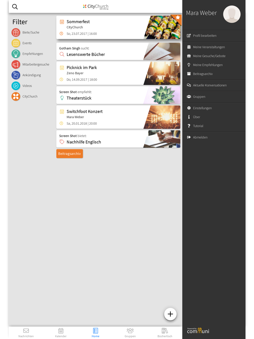 Die brandneue Community-App der CityChurch Würzburg. Du bist auf der Suche nach einem Jogging-Partner, willst deine alte Mikrowelle verschenken, oder suchst einen Wagenheber? Nichts leichter als das - die CityChurch App sorgt für die optimale Vernetzung. Herunterladen, registrieren, einloggen, genießen!