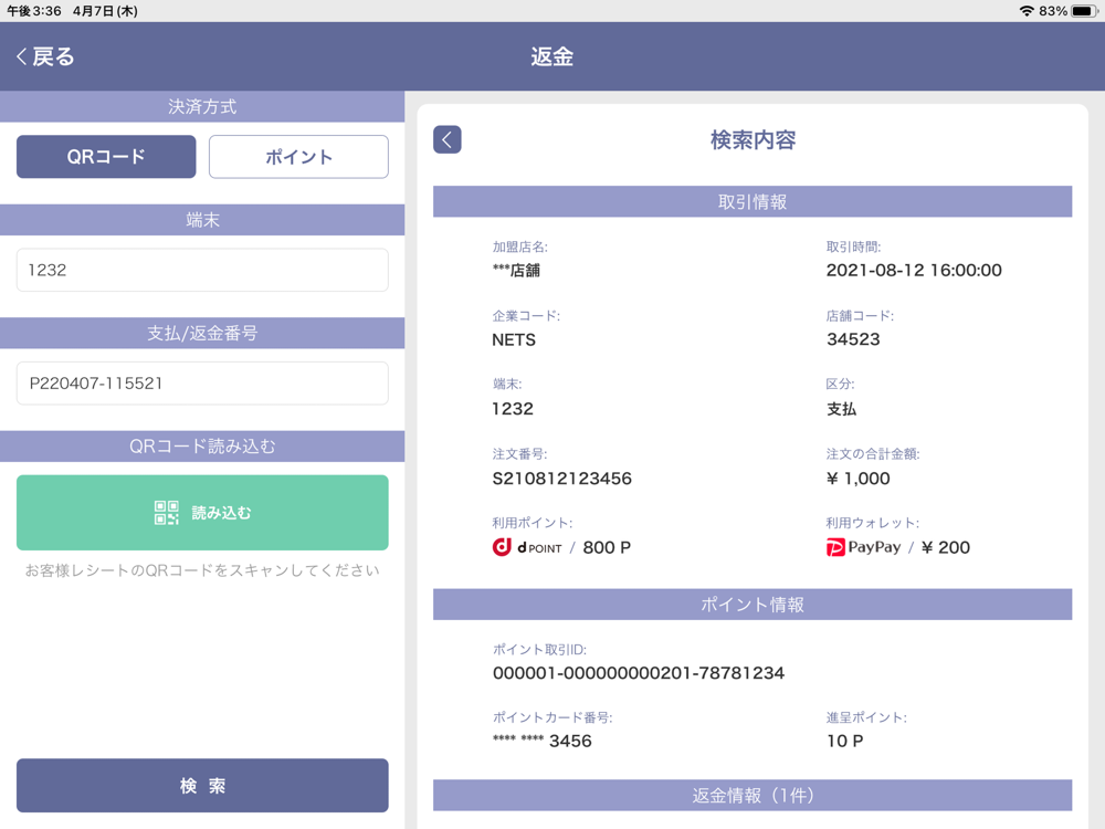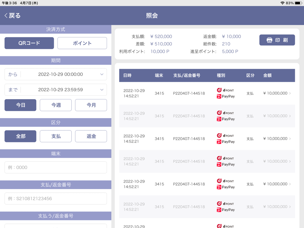 決済完了/返金完了の取引を確認できます。