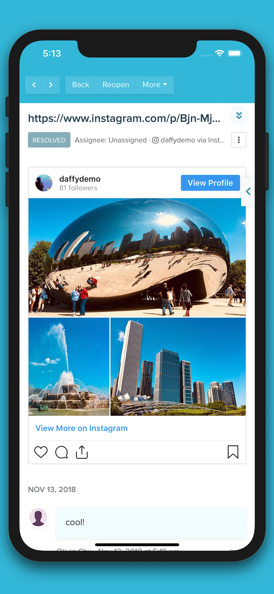 Like its web sibling, the Re:amaze mobile app extends powerful features such as multi-channel messaging via email, Twitter, Facebook, and Instagram to your pockets. Conversations from your favorite Re:amaze Embeds are also synchronized for you in real time so you’ll never lose track of important customer chatter!