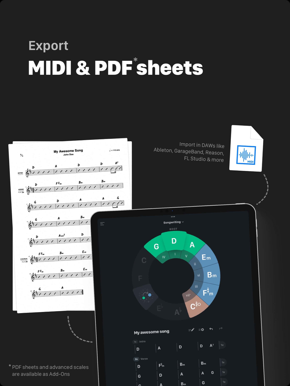 ▶ Export songs as MIDI and use them in Ableton, Reason, Garage Band, or any other DAW.