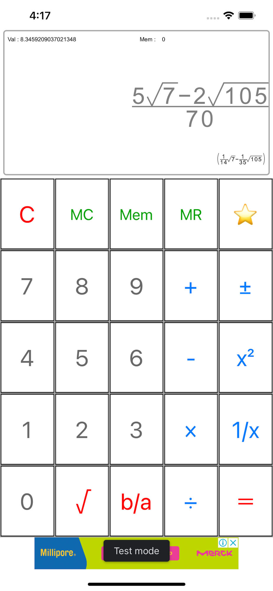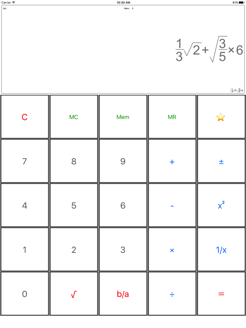 It is a calculator for calculating the square root. It can also be used to calculate fractions. You can easily enter and execute the four rule calculations of square root and square root. Since the infinite multiple-long integer is used I the internal operation, there is no worry that the digits will overflow. Especially easy to carry out rationalization which is said to be difficult to calculate.