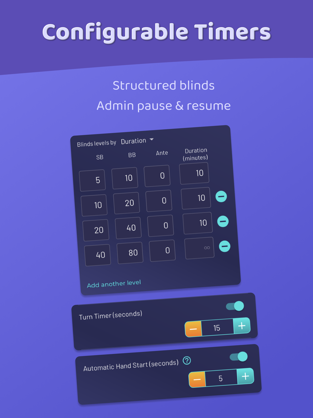 Set-up your blinds (and antes) structure based on time duration or number of hands.