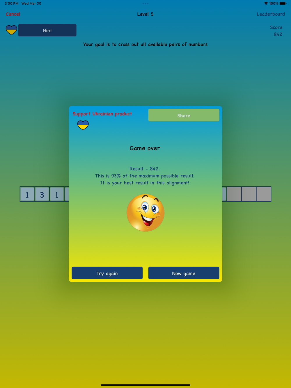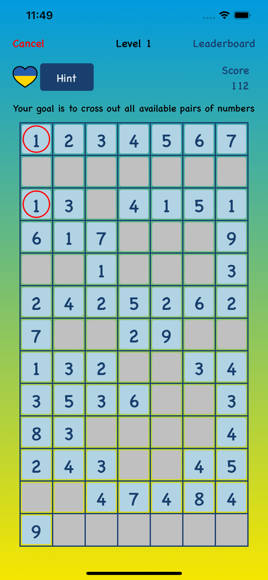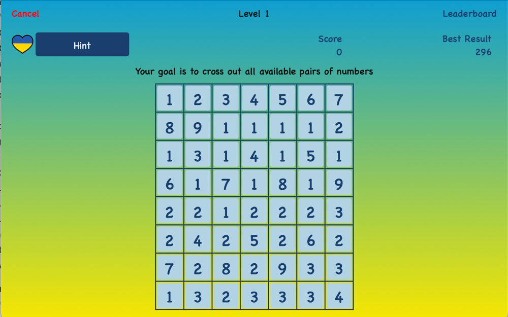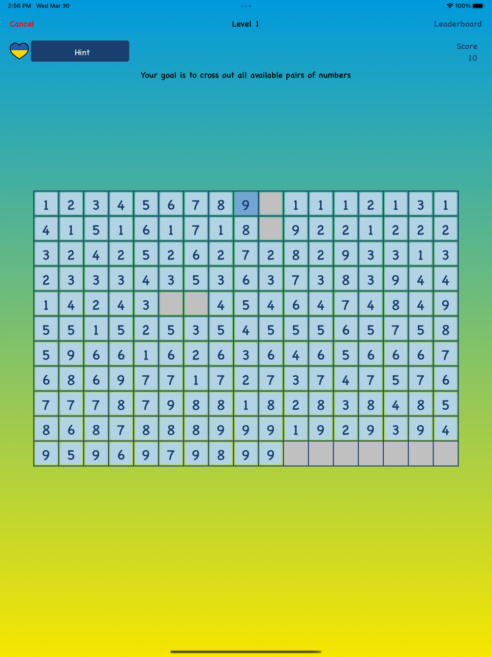 Cross out pairs of the same numbers and the numbers the sum of which is 10. Develop a strategy, find the optimal algorithm. The game will go to the next level as long as there are possible moves.
