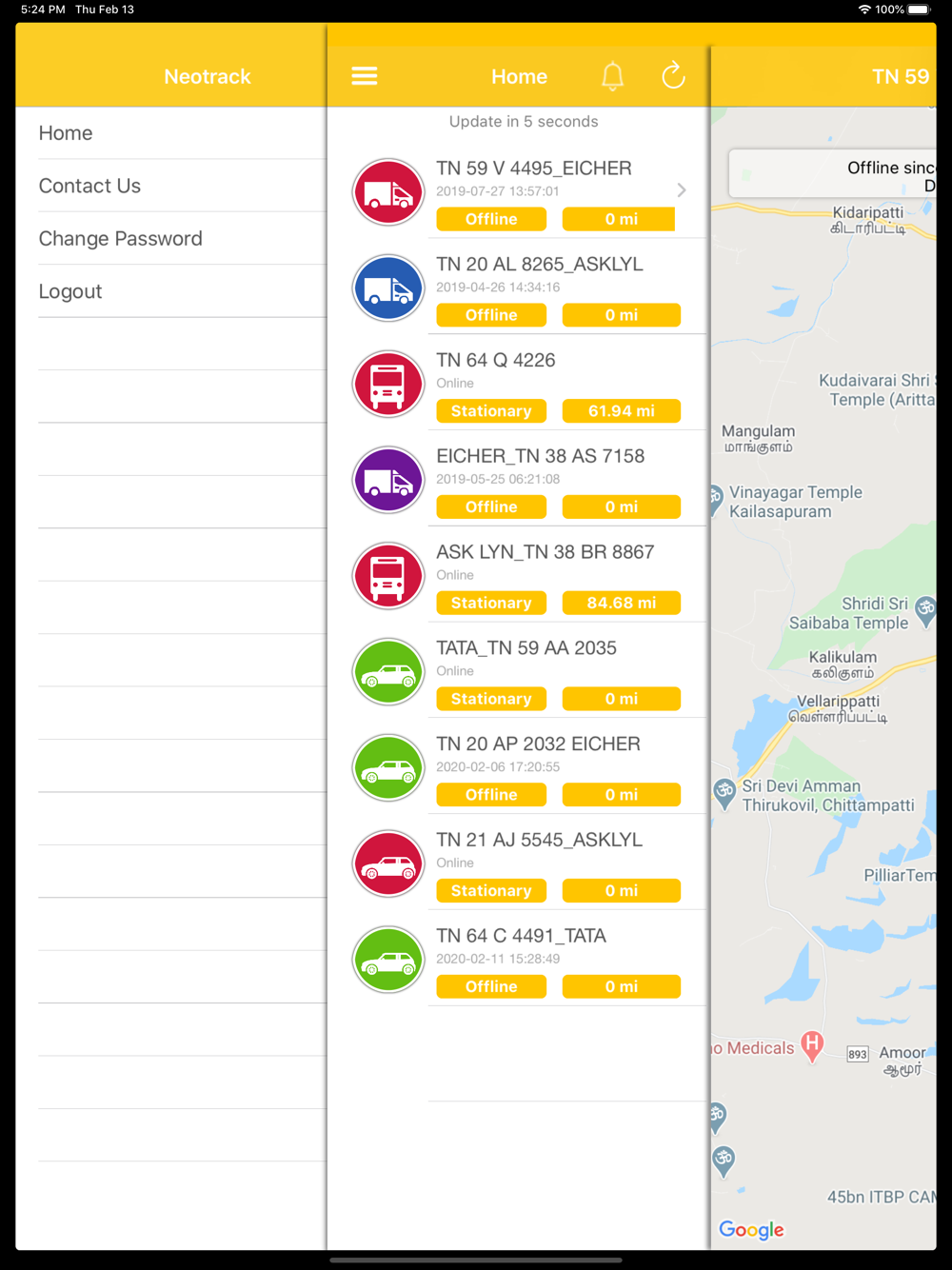 View real-time location of all the vehicles installed with NeoFleet hardware. The same credentials used in https://track.trackbee.in has to be used here.