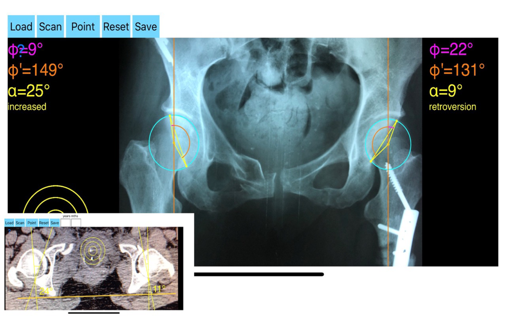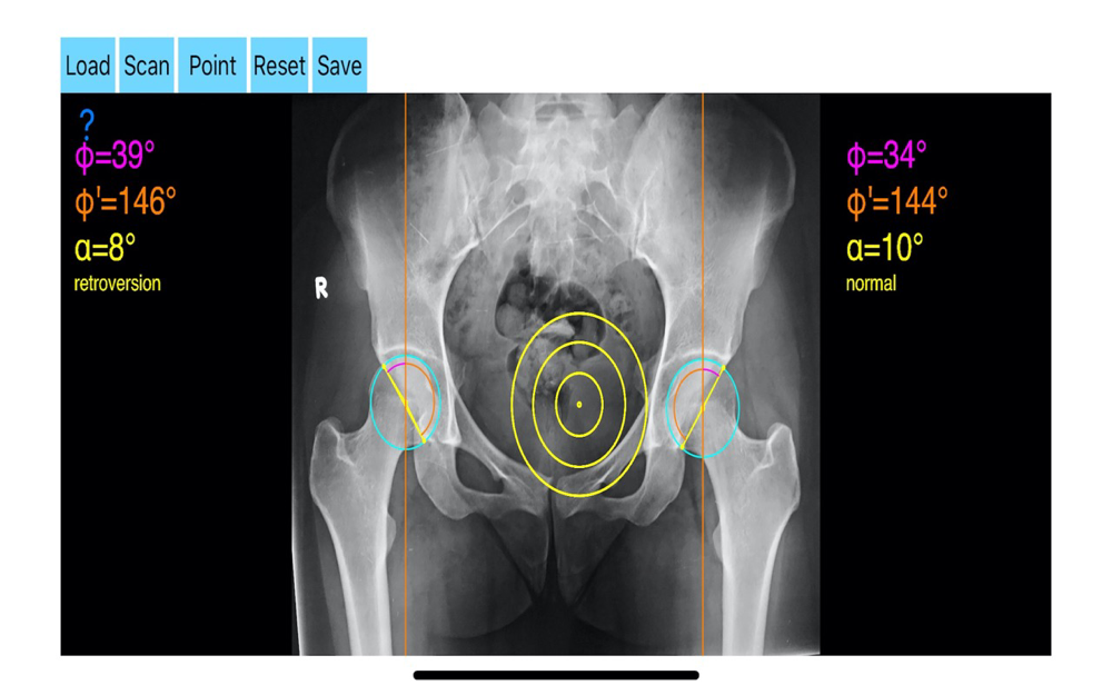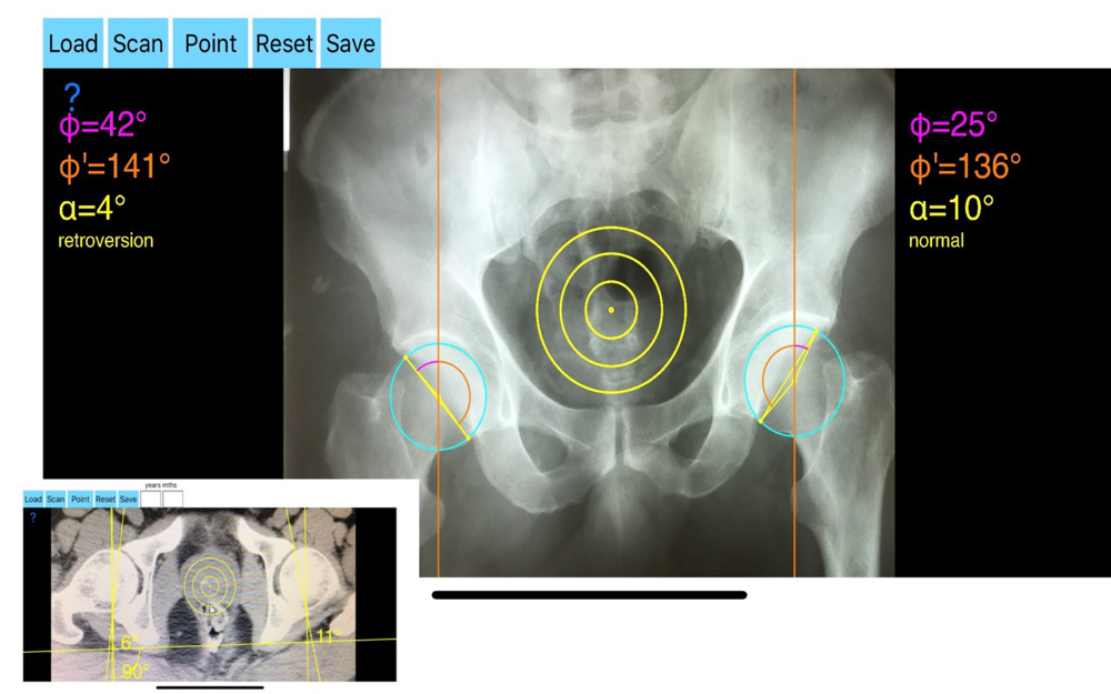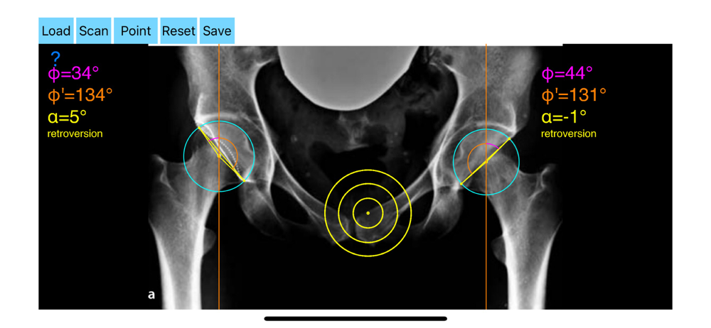 -By marking certain points in a simple standard AP pelvic radiograph, geometric parameters are being calculated. The App computes the acetabular anteversion based on a pelvic AP radiograph. The angle of anteversion is calculated through the formula according to Heftis nomogram. The acetabular orientation (anteversion/retroversion) is determine by the app by the measurement of the angles between the center of the femoral head and the anterior (φ) and posterior (φ’) acetabular rim.