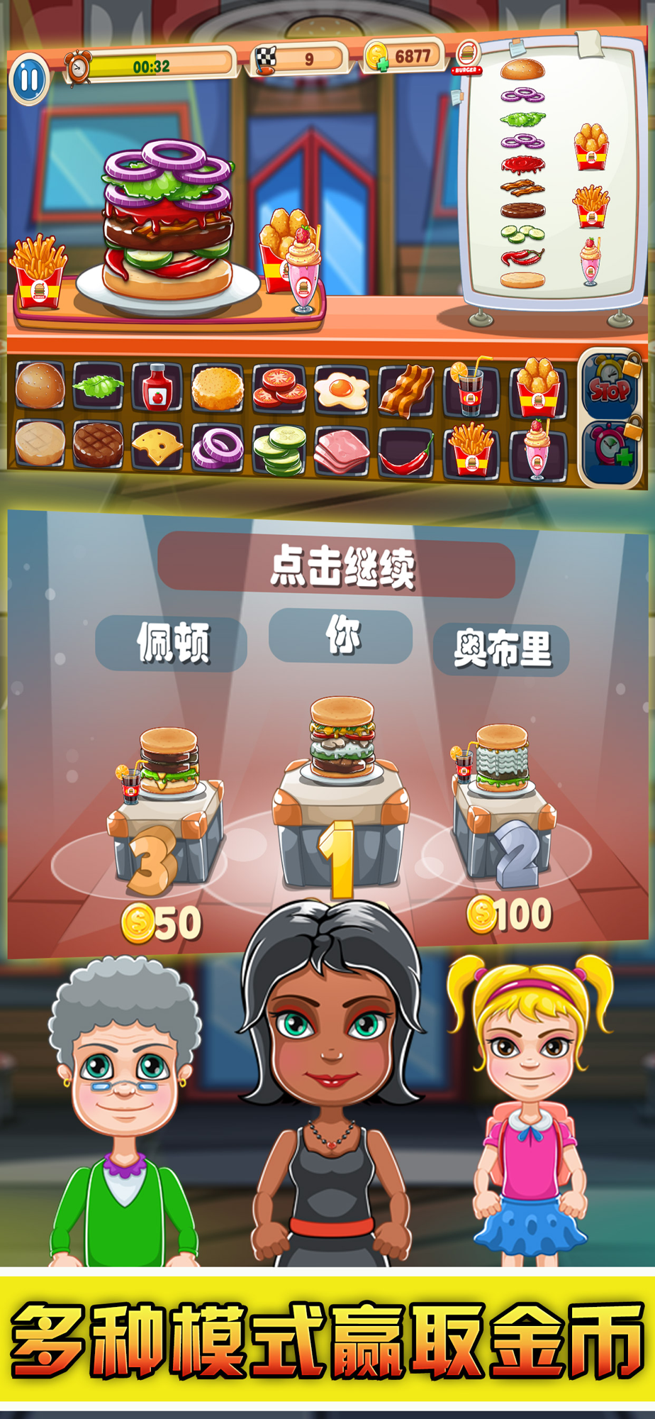 你是否想体验开一家属于自己的汉堡店的感觉?”可口的汉堡“全新上线,满足你的一切想象!尽你所能满足顾客的汉堡订单,根据顾客的需求搭配食材。赚足够多的钱,升级解锁店铺的食材和设备,让你的汉堡店生意蒸蒸日上!
