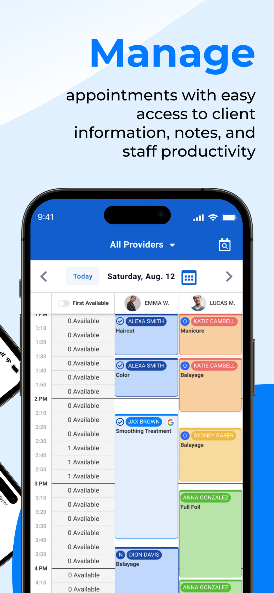 - Appointments – Easily book and modify appointments with simple drag and drop capabilities.