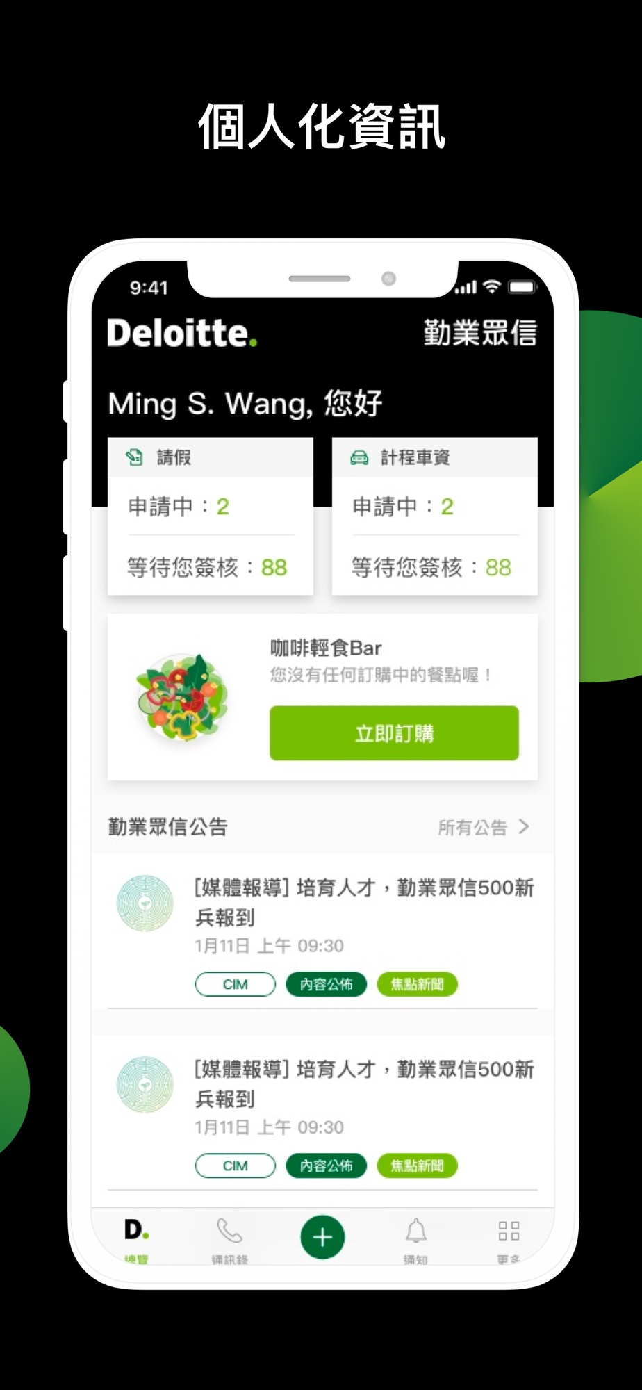 勤業眾信專屬行動辦公室(Deloitte APP),隨時隨地都可以辦公,用行動進行公文申請及簽核批閱等電子簽核,用行動線上訂餐咖啡輕食下午茶…….針對「工作面」、「生活面」之功能滿足應用需求,提供適時適地的實用及易用原則,用行動掌握勤業眾信即時資訊!