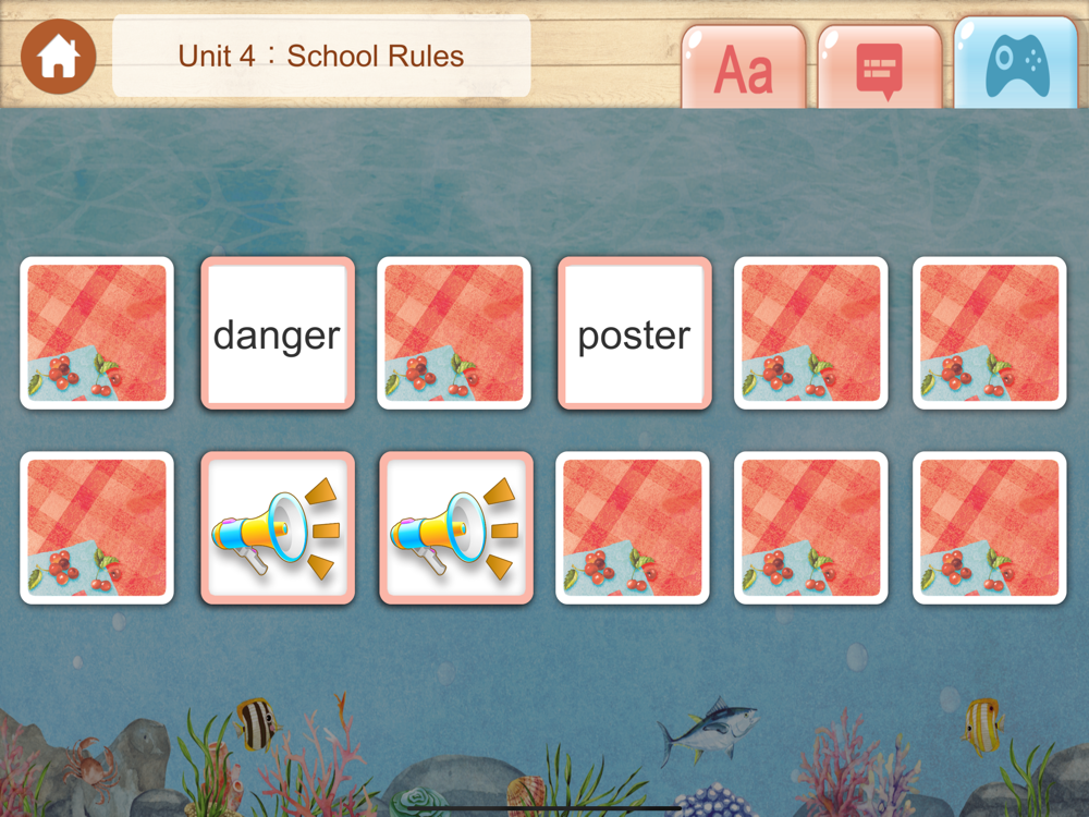 *Game: 點選文字和圖像配對的翻牌遊戲,來驗收學習過後的成果,會依冊別增加難度。