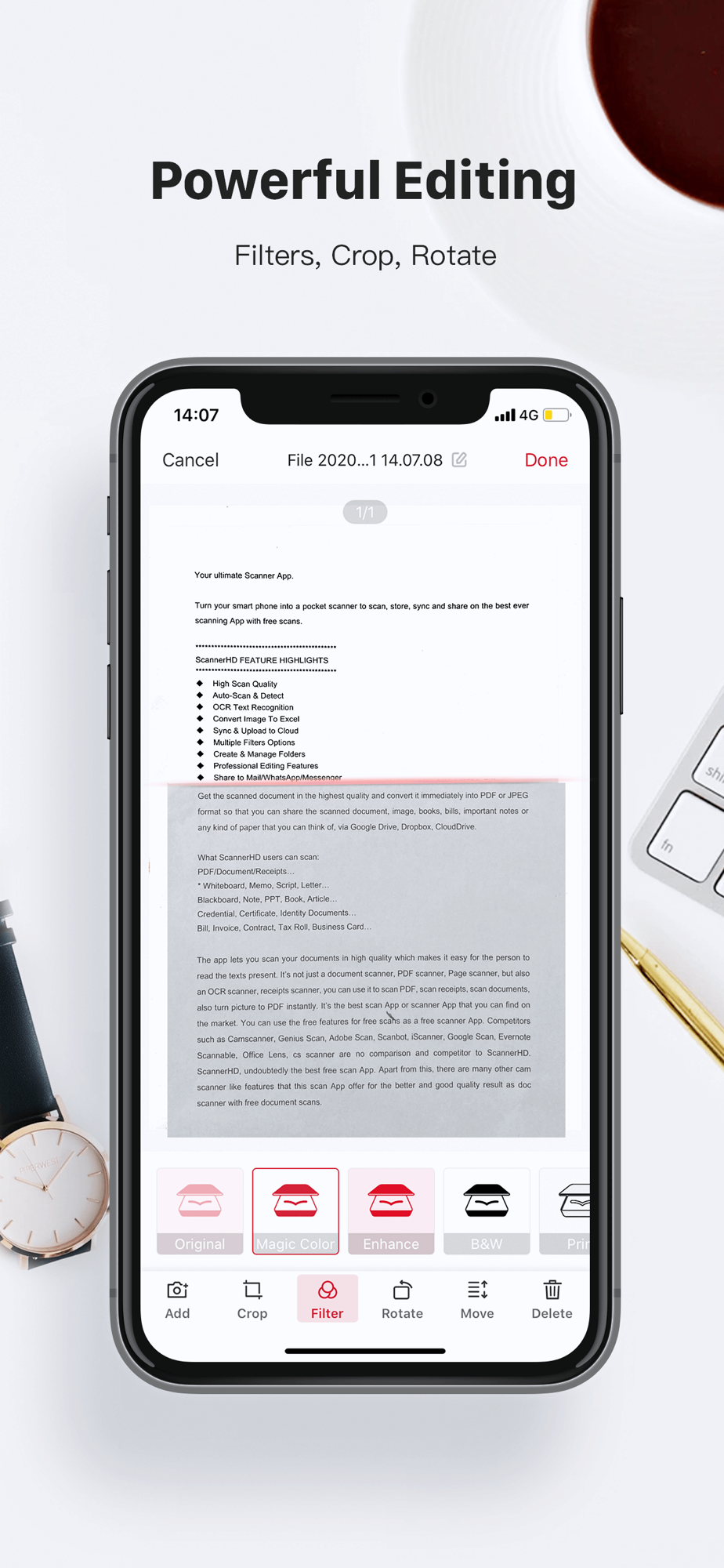 Share the files immediately over mail, Dropbox, CloudDrive, Google Drive, or via link to enjoy the joy of scanning. ScannerHD Pro allows the user to convert the scanned document to JPEG format or PDF format. You can even print the scanned document or image over air print. The app also offers various professional editing features even after saving the images along with various multiple filters.