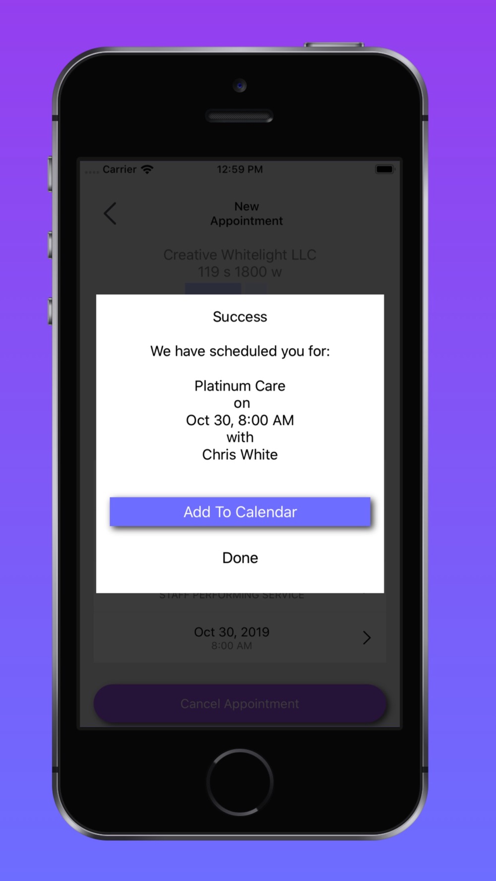 Welcome! Everyone should be able to book appointments from one app within a few clicks. Instant booking. No need to call to create or modify an appointment. No holds. Look up your appointment instantly and set custom reminders via email and push notifications. Create a free account, join businesses with a simple activation code, create appointments